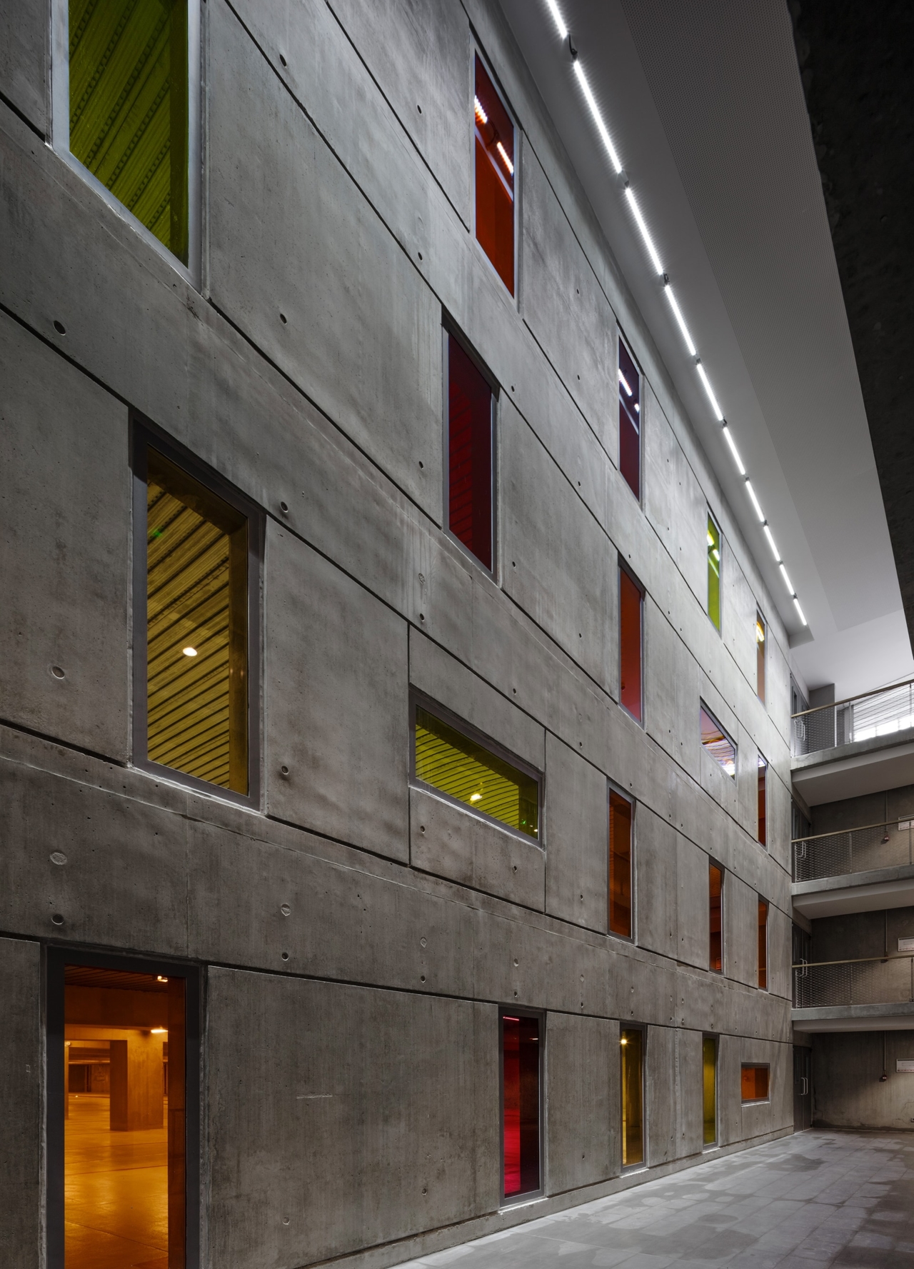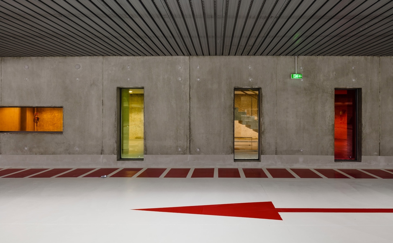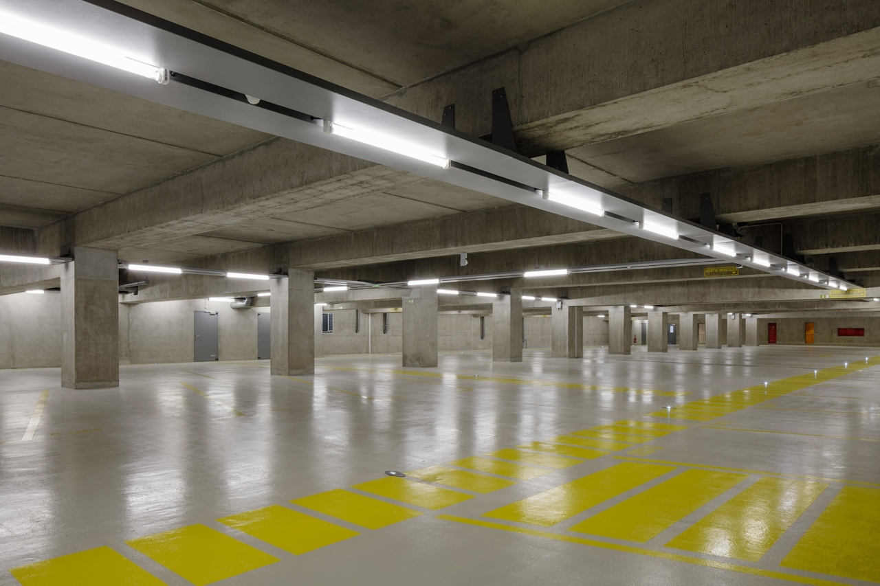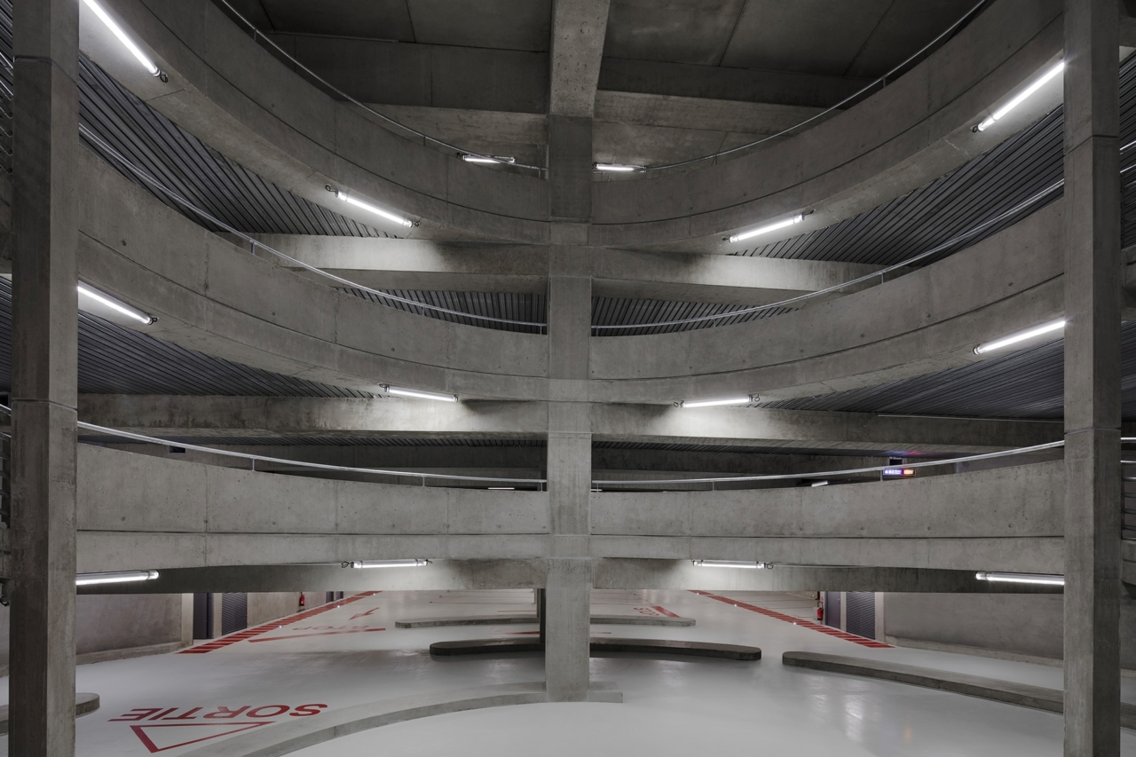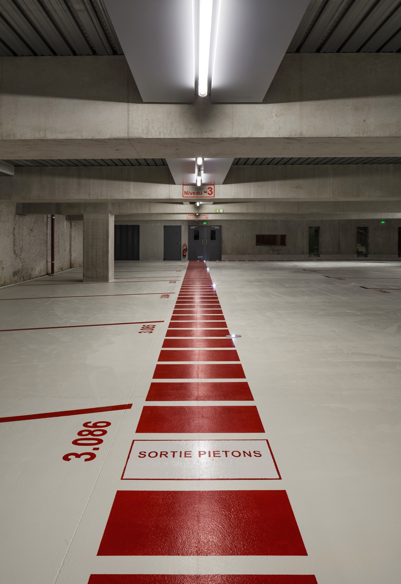 Notre projet est marqué par la présence de deux failles : deux éléments architecturaux forts qui viennent « encadrer » la zone de stationnement. Une faille est réservée aux connections verticales pour les piétons, et se situe à l’ouest du projet. Elle est traversée par un escalier encloisonné et permet la connexion avec le métro. La deuxième faille se situe à l’est et est dédiée aux deux rampes de circulation des véhicules uniquement. Depuis chaque niveau, les failles permettent une lecture des accès piétons comme véhicules. Elles guident les utilisateurs par leur lumière « à part ». Ce sont des « puits de lumière » qui filtrent la lumière du jour et la complètent de lumière artificielle.