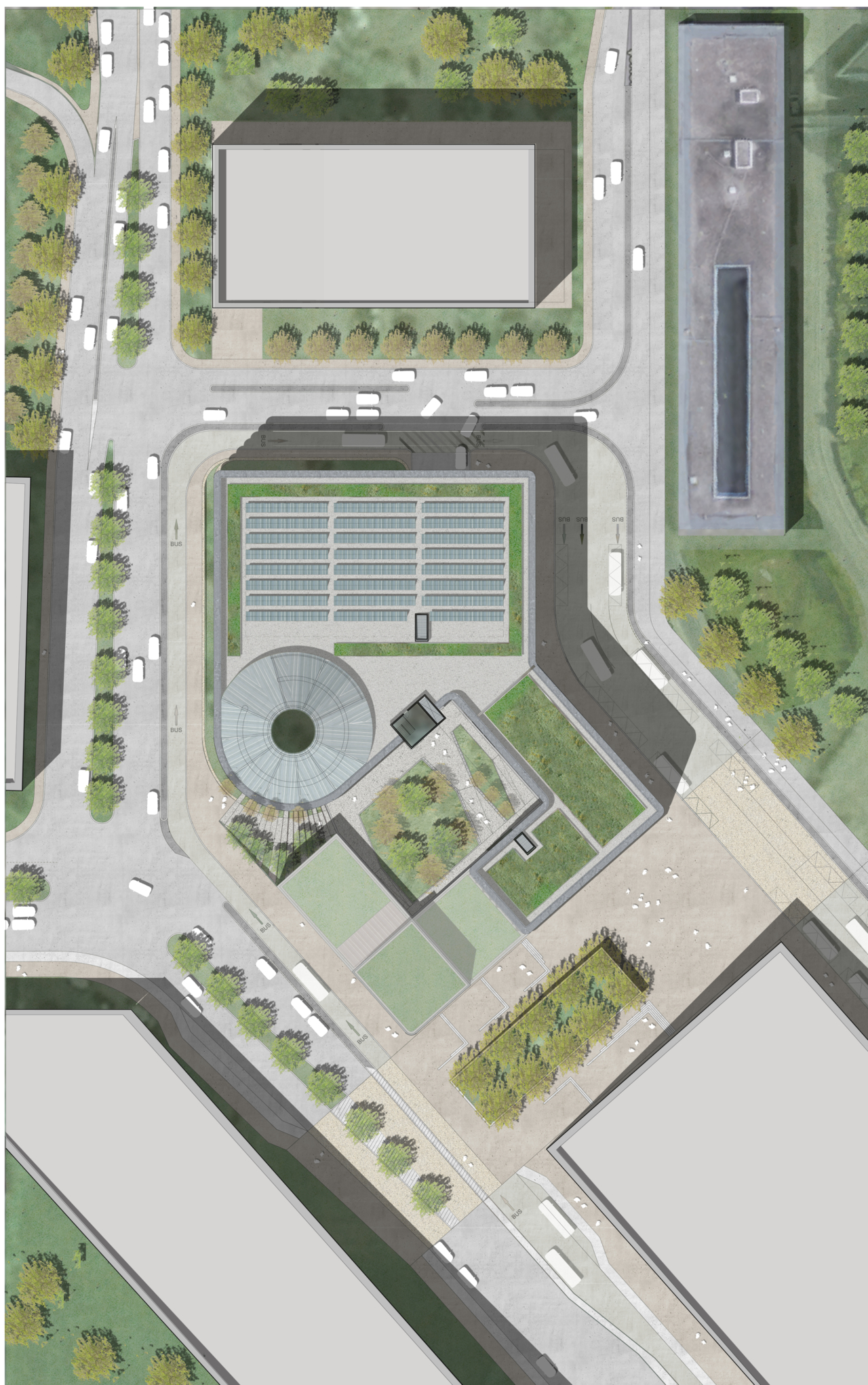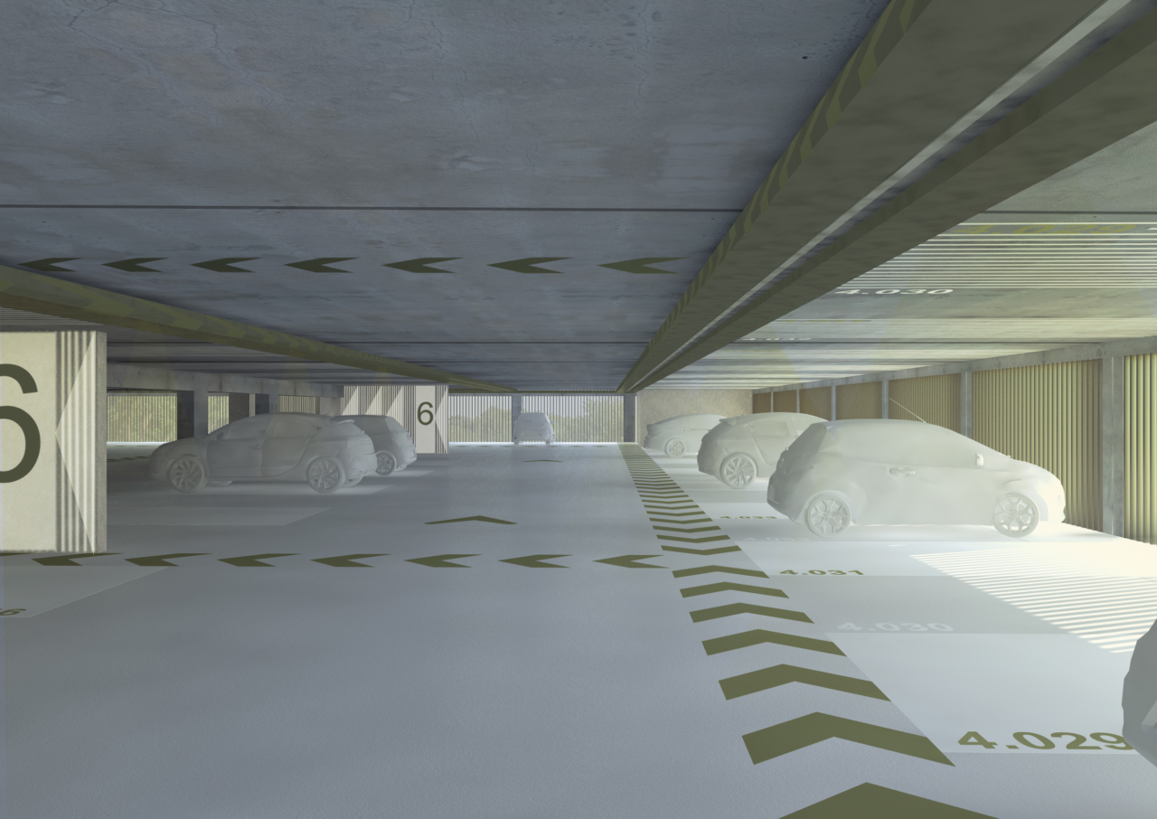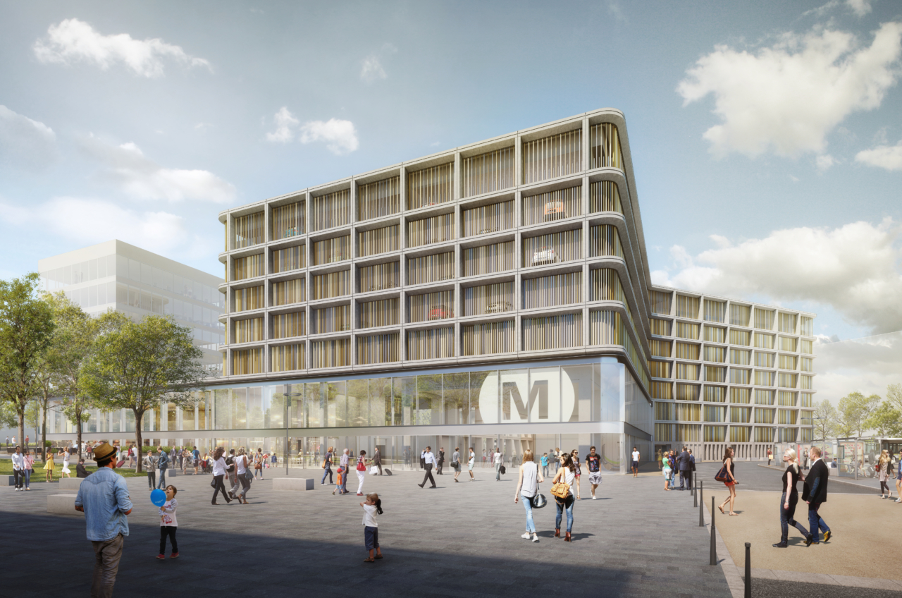 Le parking va former dans un environnement aujourd’ hui très végétal mais demain très urbain, un ilot dense, composé de plusieurs fonctions : le métro, le pôle bus, le parking, bureaux, commerces. Par sa taille il constituera l’élément le plus visible du pôle modal et de la station de métro. Il exprimera donc l’image du réseau de transport métropolitain, son ancrage dans ce nouveau quartier.
