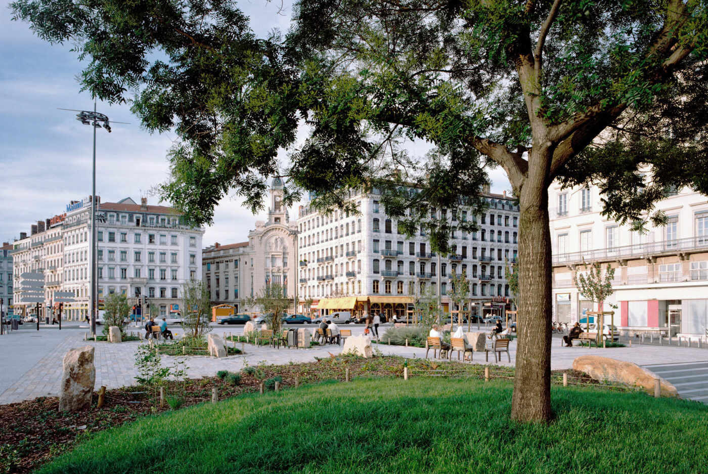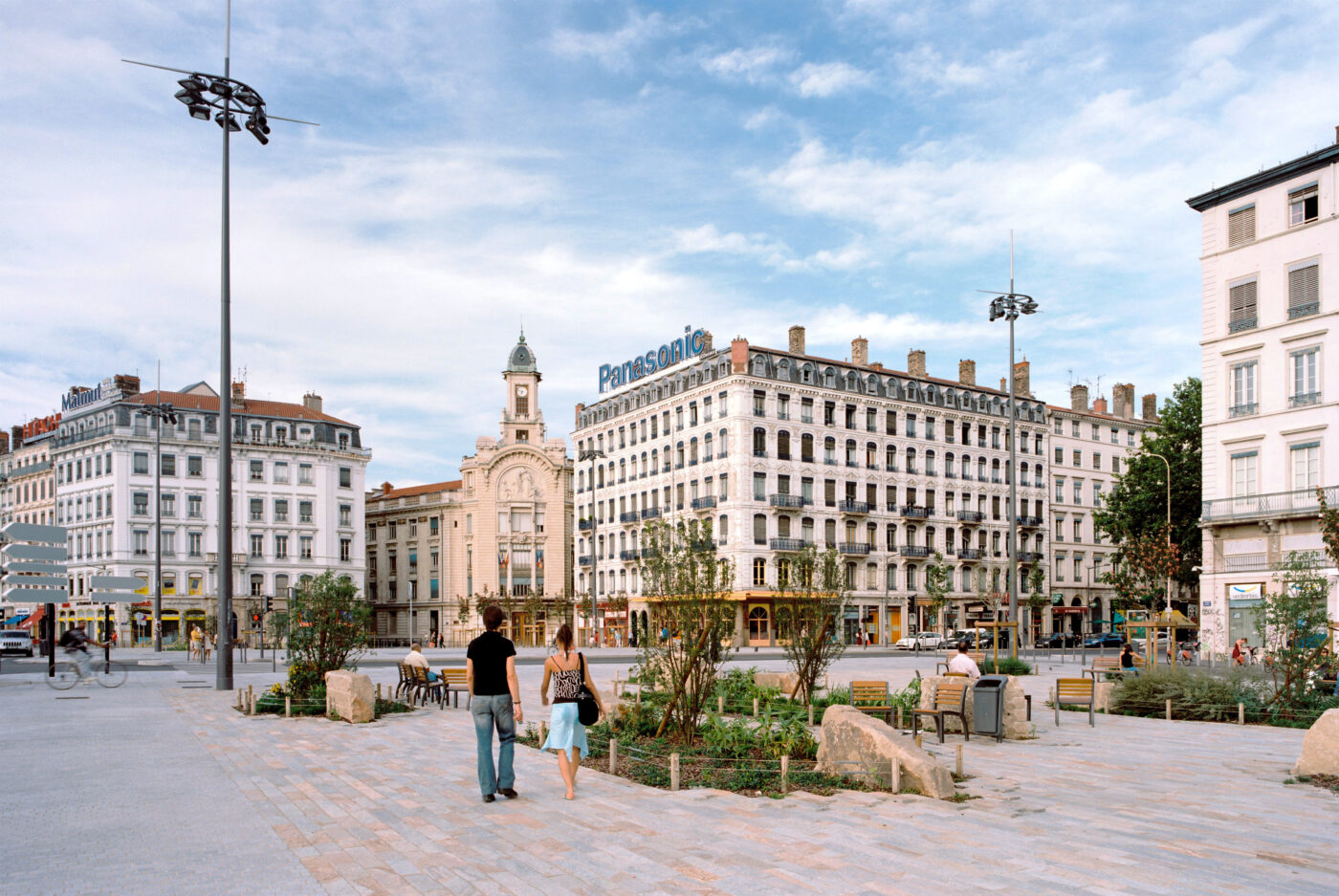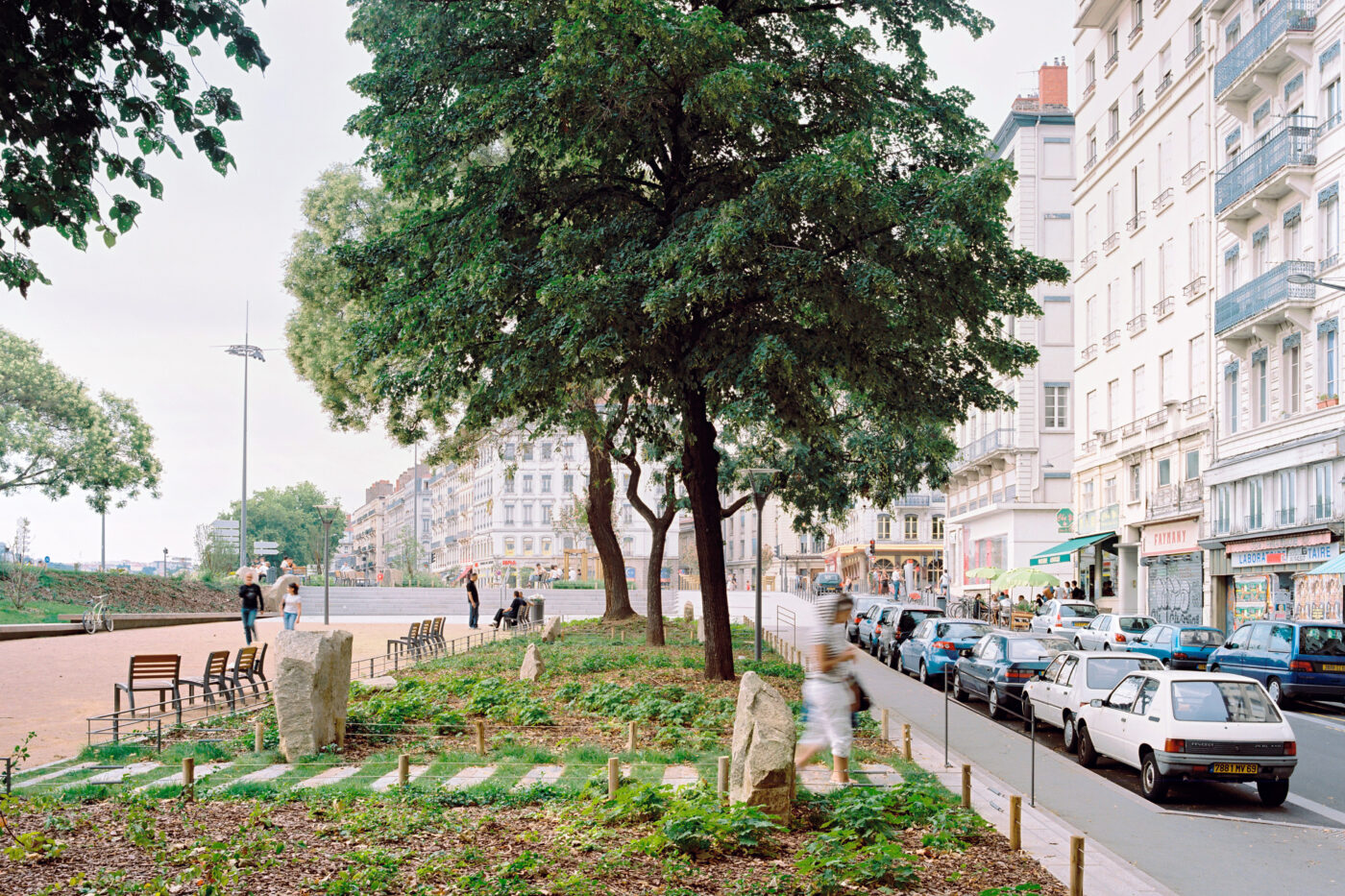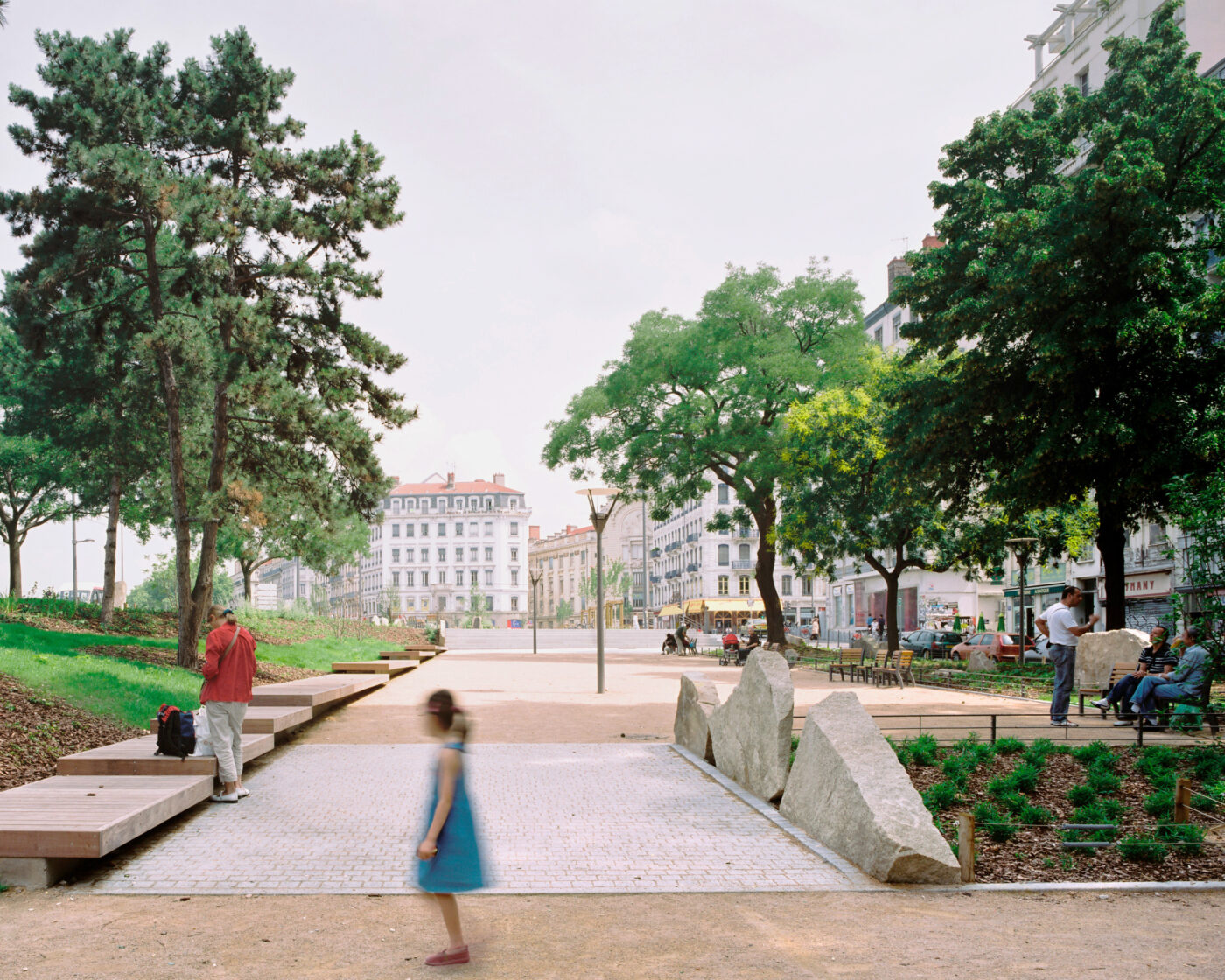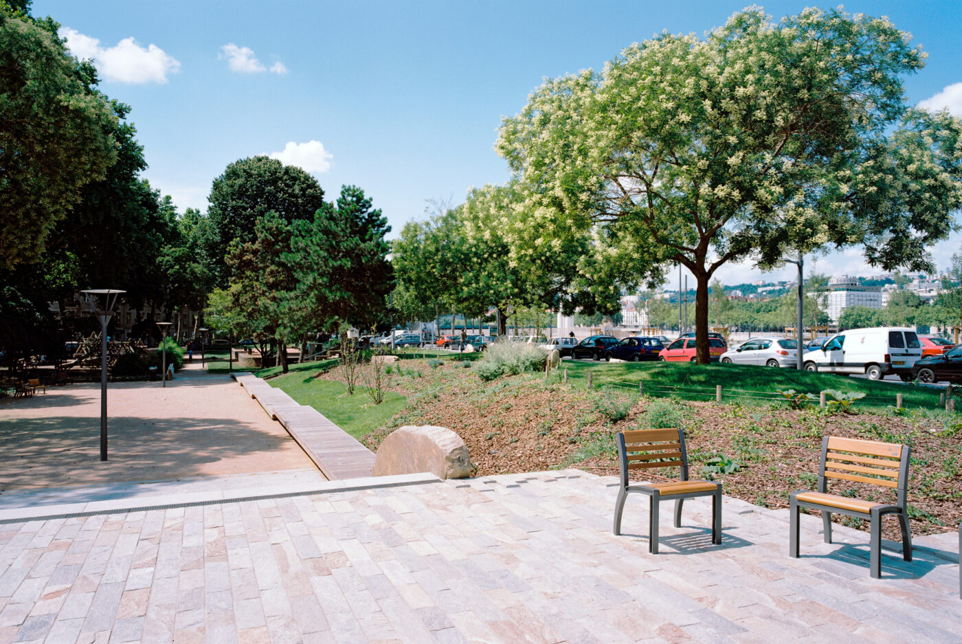 Nous avons dessiné le site, dans une approche contextuelle, pour révéler l’architecture et le patrimoine paysager existant, en affirmant la beauté du site et des vis-à-vis Fourvière/Presqu’île/Guillotière, en soulignant le cours Gambetta, épine dorsale qui distribue le cœur de ville, en enrichissant la perception et la relation au Rhône, en maintenant dans la mémoire collective, la force symbolique de l’ancienne fosse aux ours, identifiée jusqu’ à maintenant par sa géométrie circulaire et en transformant un espace clos et en creux, la fosse, en un espace ouvert et plan, la place.