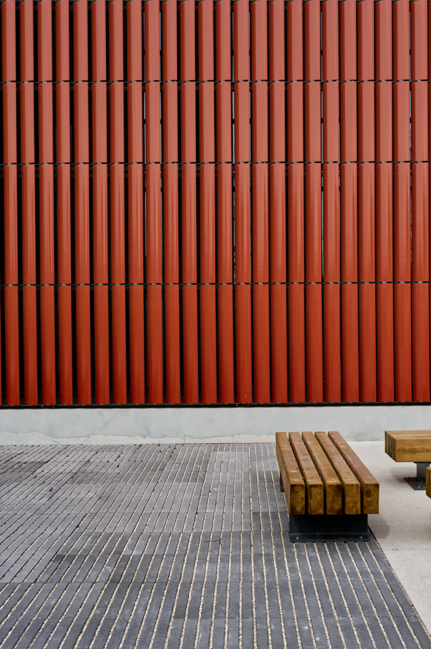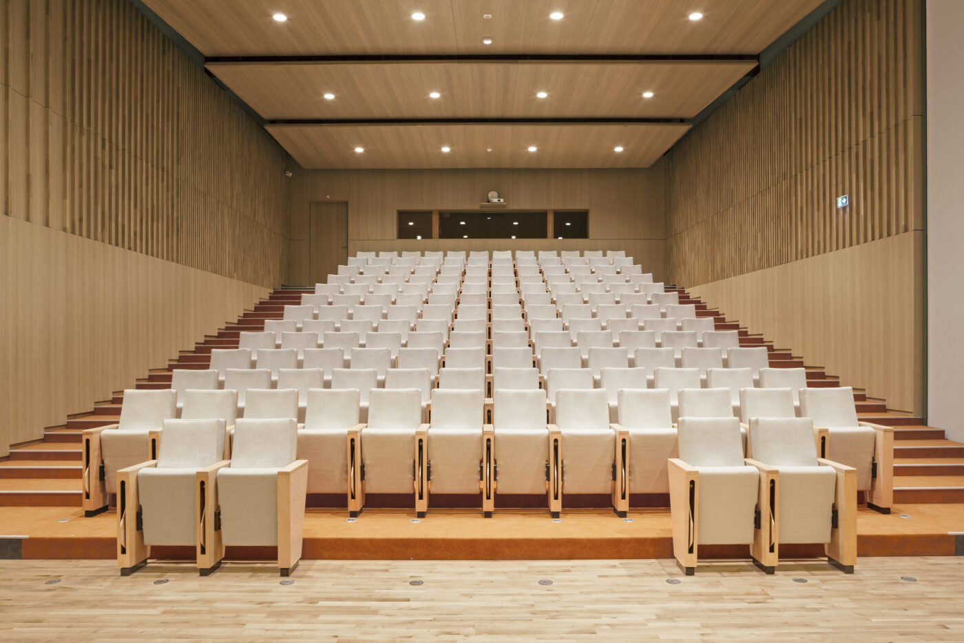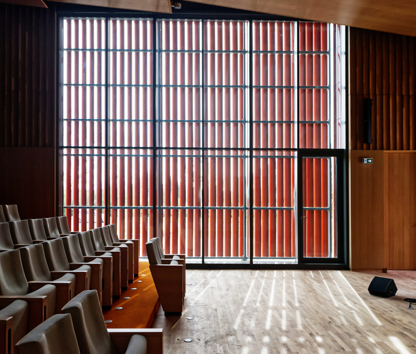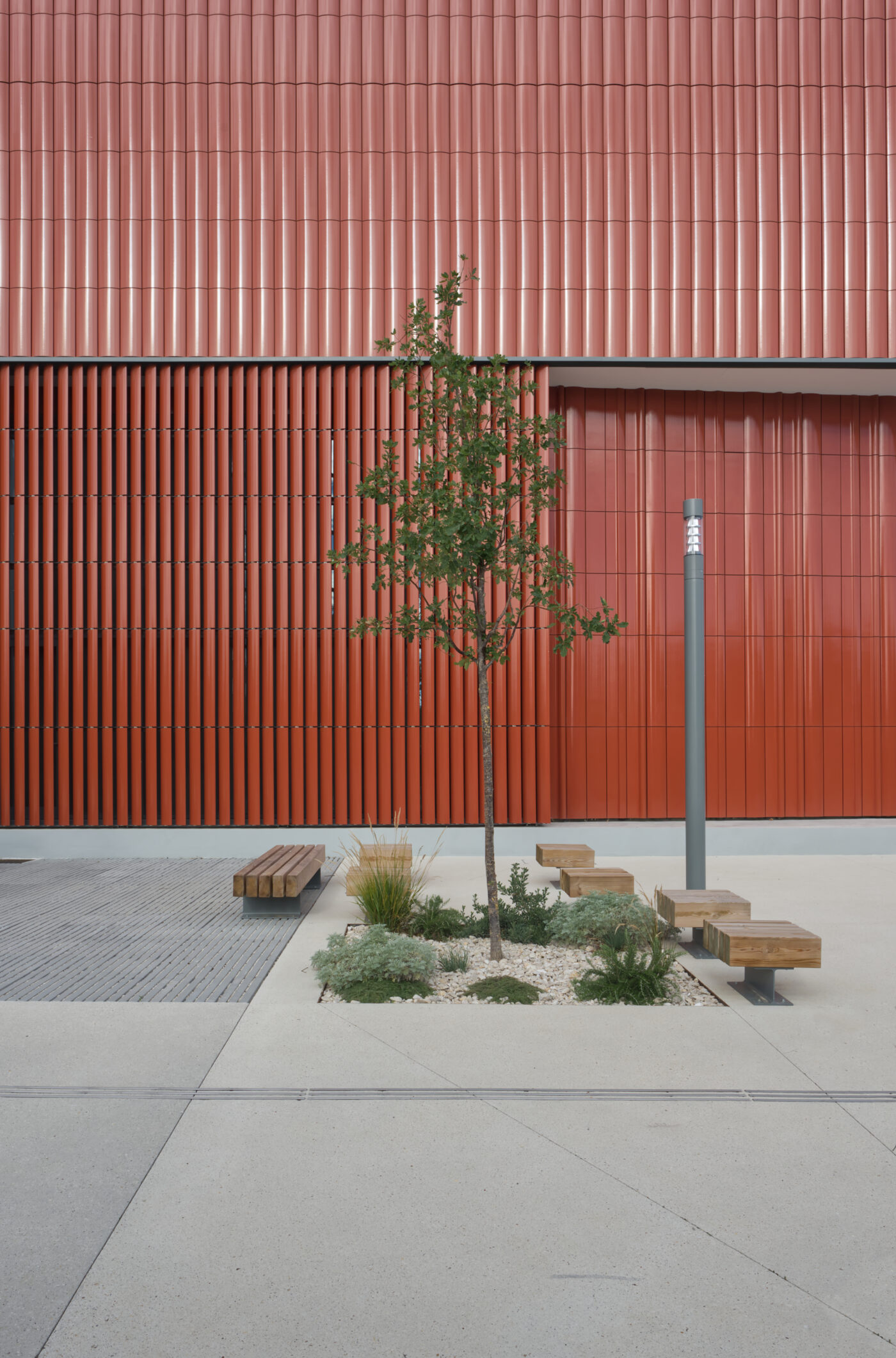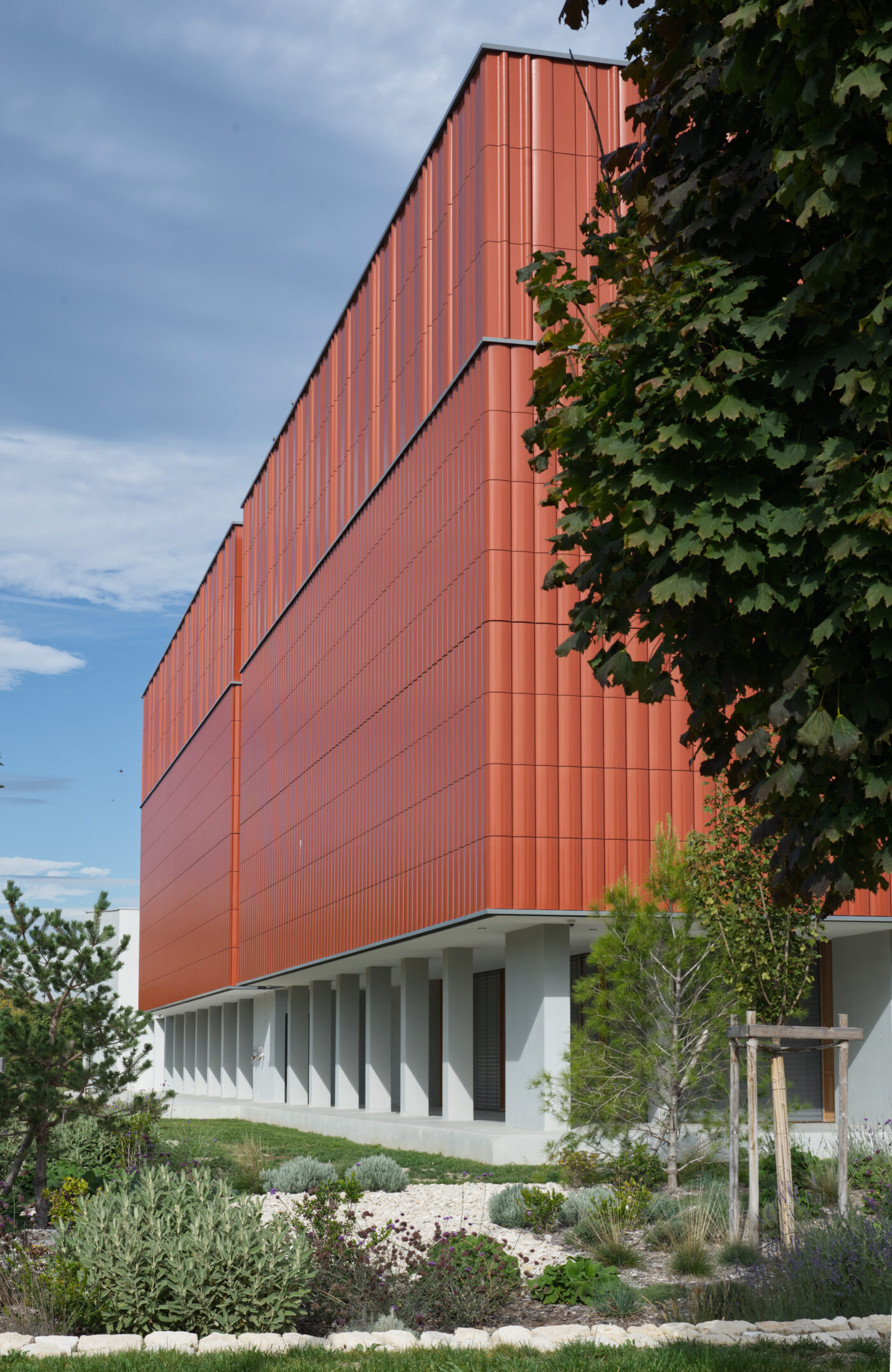 Outre cette matière noble qu’est la terre cuite, le béton en soubassement et le bois, matériau de construction de tous les espaces de service, constituent l’écriture architecturale du bâtiment.