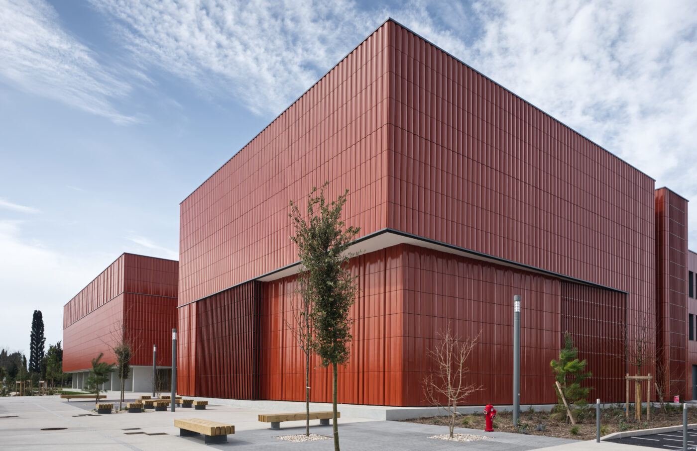 L’enveloppe des magasins est conçue comme une double peau, une « bouteille thermos ». Autour des voiles de béton, une deuxième peau étanche, habillée de terre cuite, permet de réguler l’inertie et l’hygrométrie de ces grands volumes, d’optimiser leur performance énergétique.