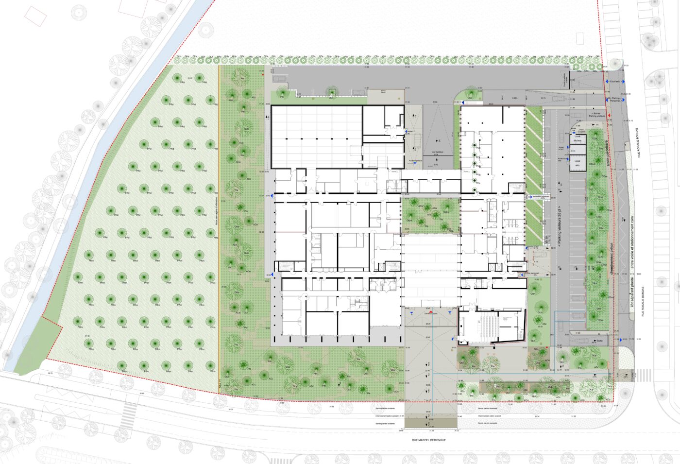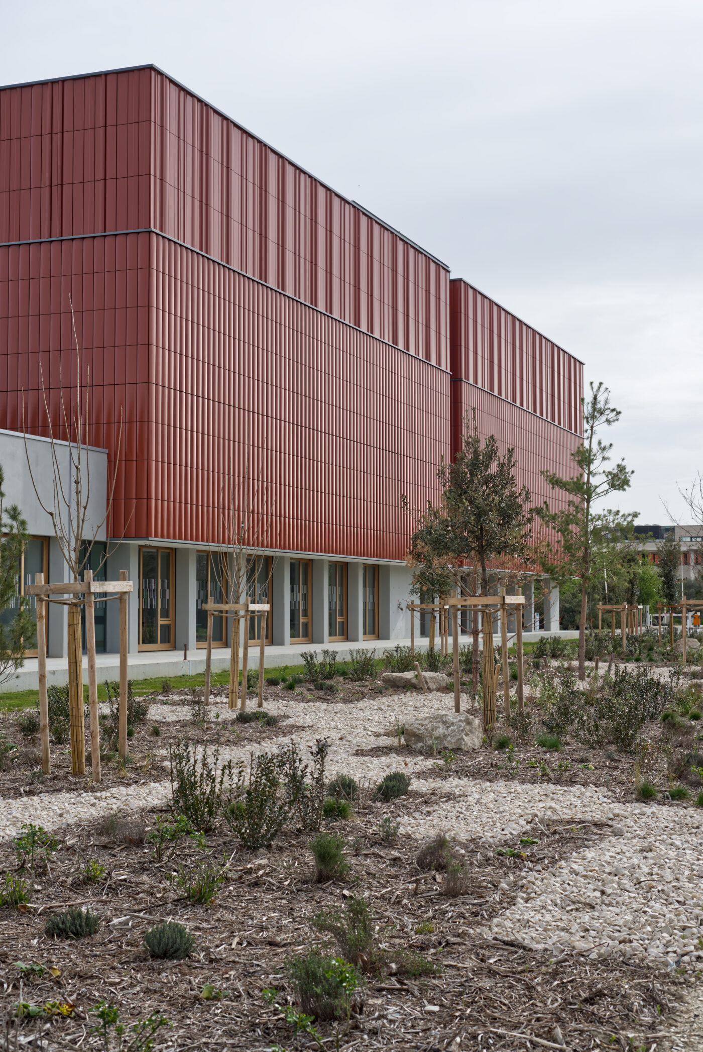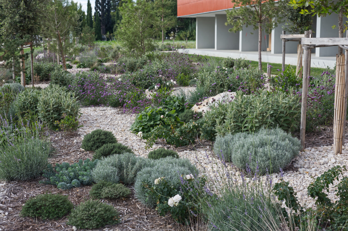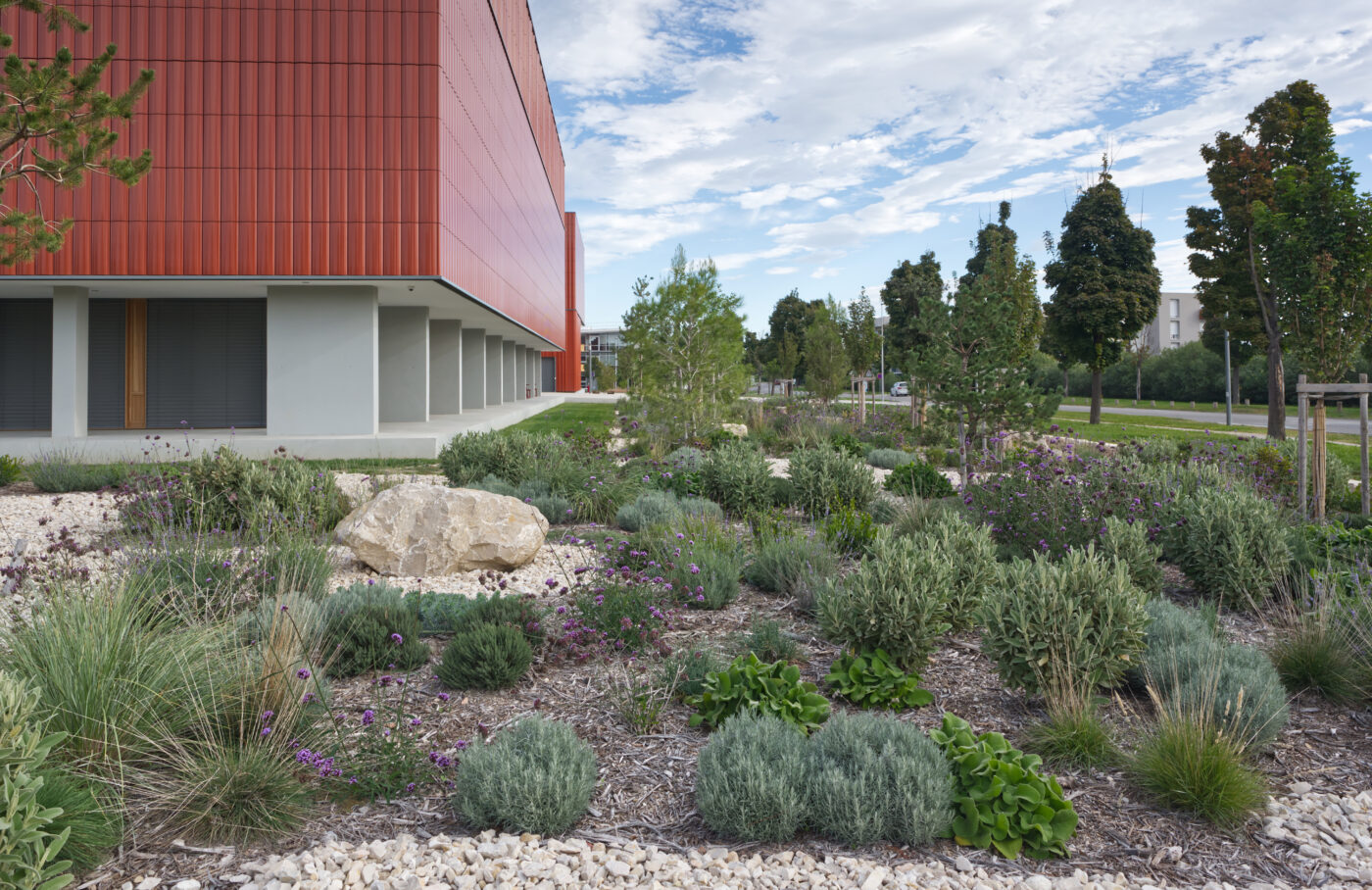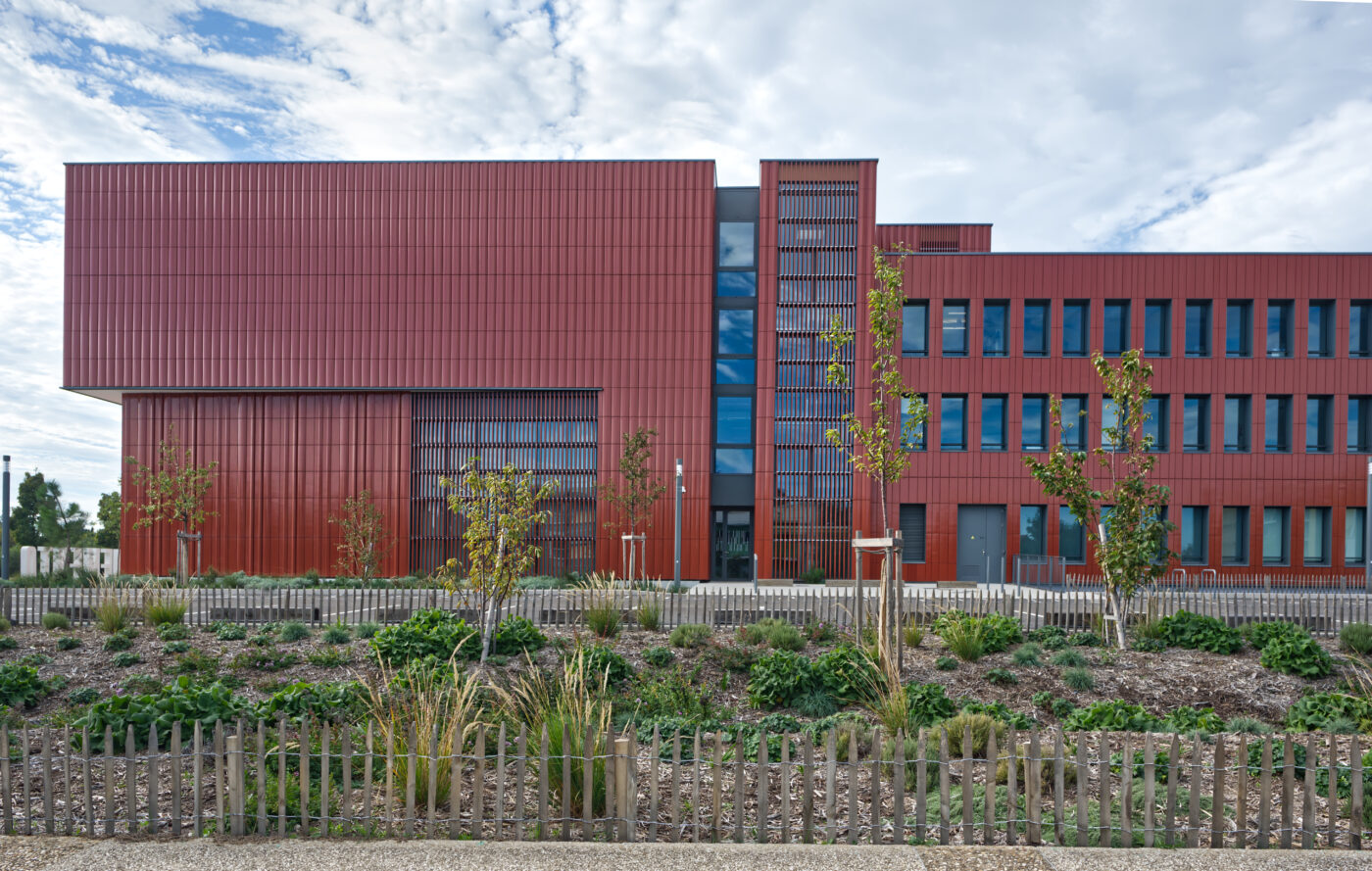 Le pôle de conservation est à la fois un projet architectural et un projet paysager. Ce projet, qui favorise la biodiversité, s’appuie sur une juste palette végétale : une haie reconstituée sur la nouvelle limite ouest, pour se protéger du vent, une chênaie comme écrin pour souligner le bâtiment le long de la rue, un verger productif (fruitiers), en continuité des parcelles de l’Inra au sud.