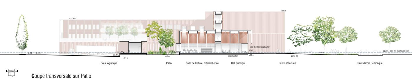 Ainsi depuis l’espace public on perçoit en premier lieu l’auditorium, la salle d’exposition et les espaces pédagogiques. Au bout de la large faille visible depuis la rue, se dresse le hall. Lieu de vie et d’échanges il articule toutes les fonctions du pôle et ouvre sur la salle de lecture, elle-même prolongée par un patio ombragé.