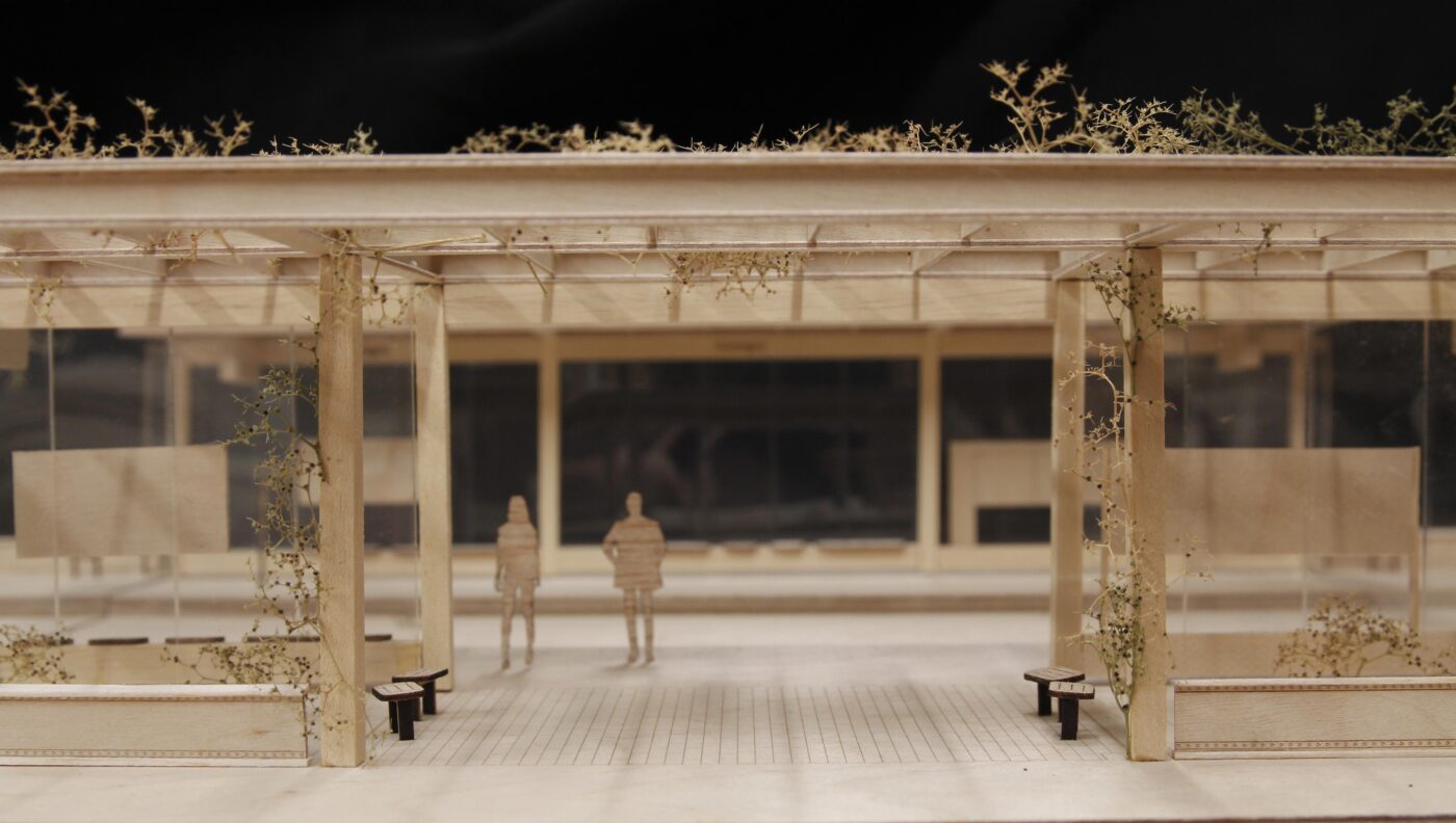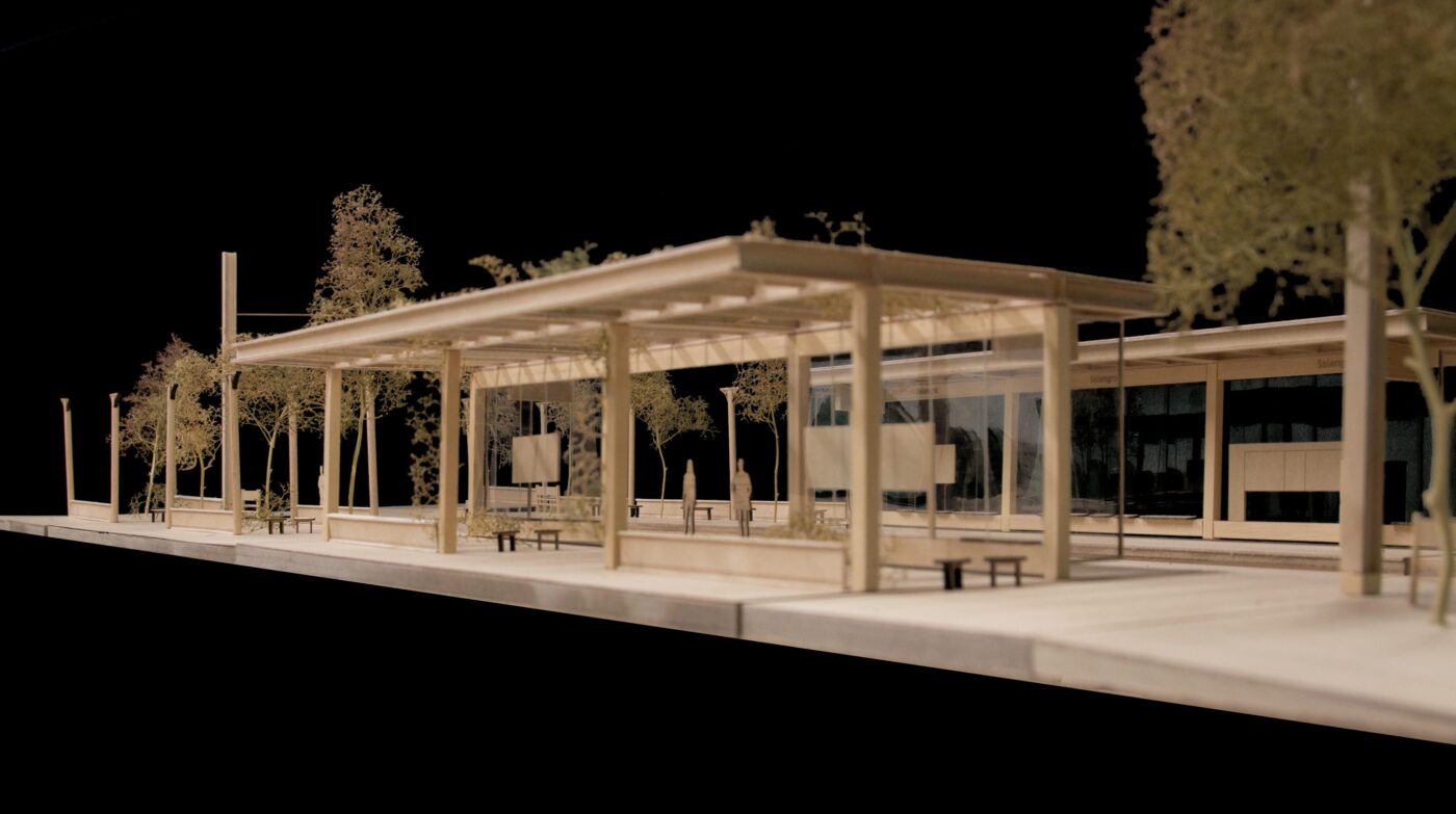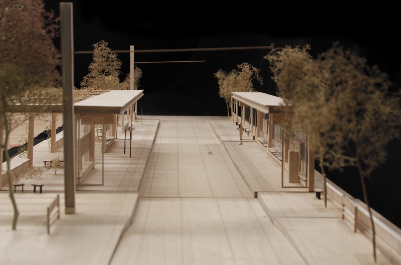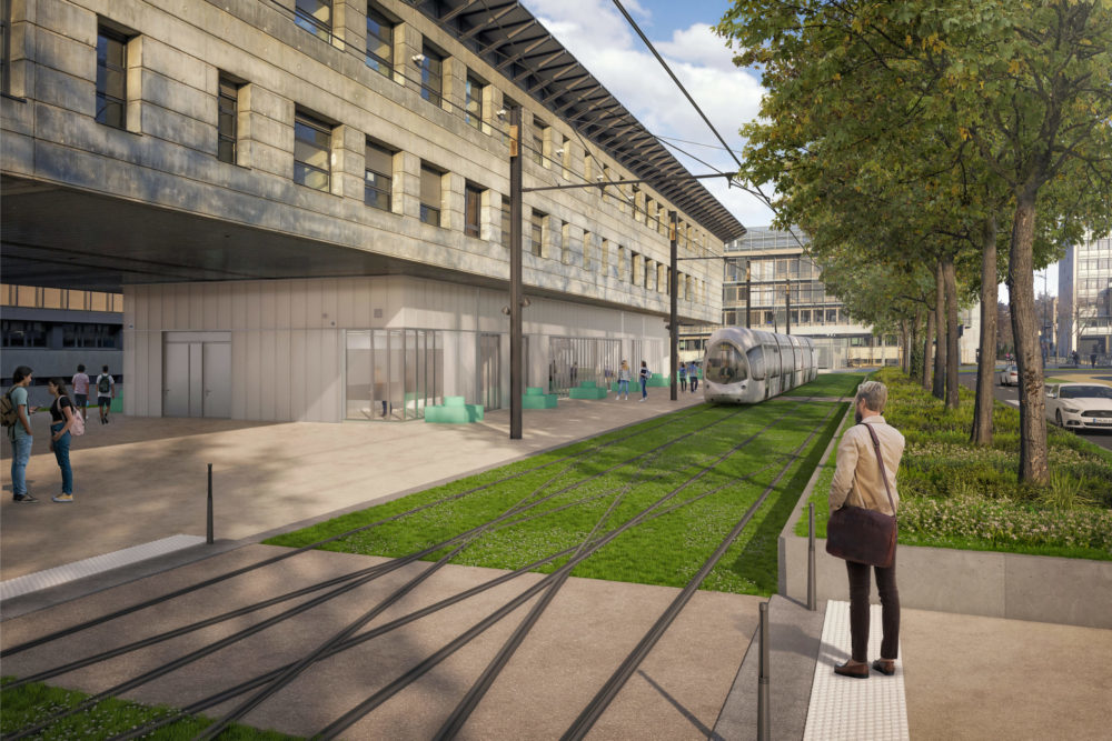 Proposer une identité singulière qui évoque le passé industriel du site, par un design composé de profilés métalliques aux formes orthogonales et épurés. Une station traversante qui s’adresse aussi bien au quai du tramway, qu’au parc attenant dont il constitue une porte d’entrée. La structure qui assure les fonction d’abri et d’attente voyageur se transforme alors en pergolas support de végétation, générateur d’ombrage et marqueur de