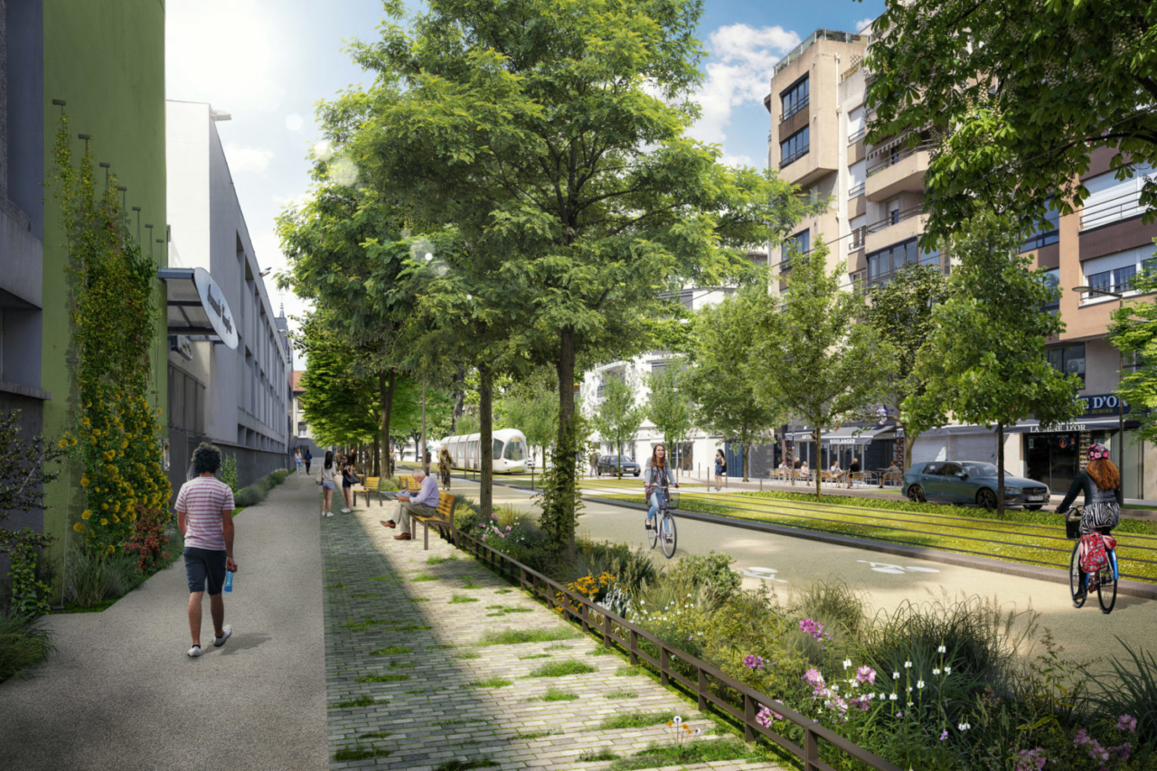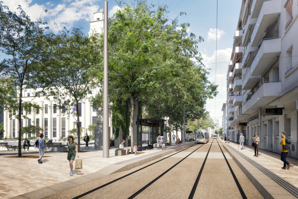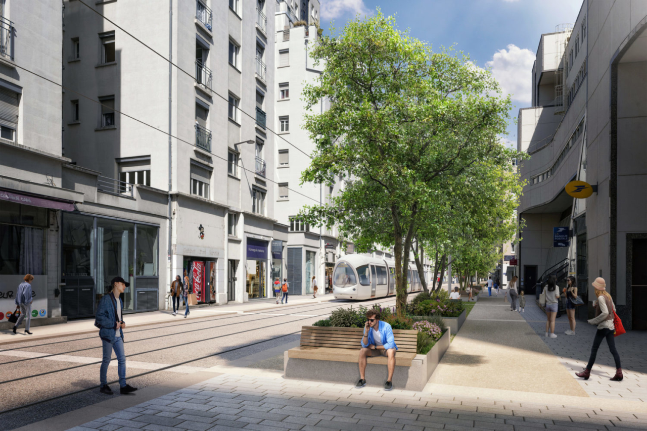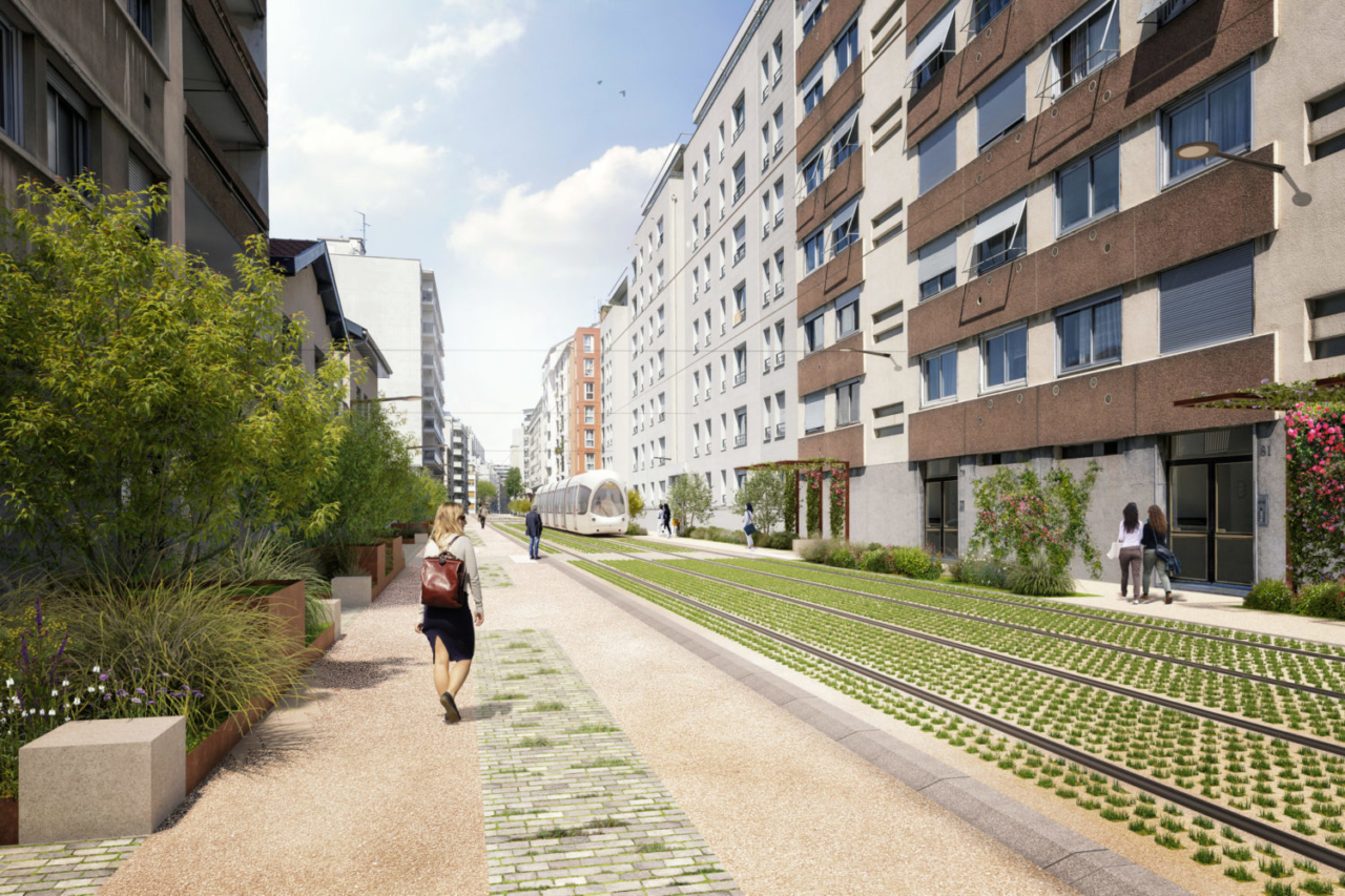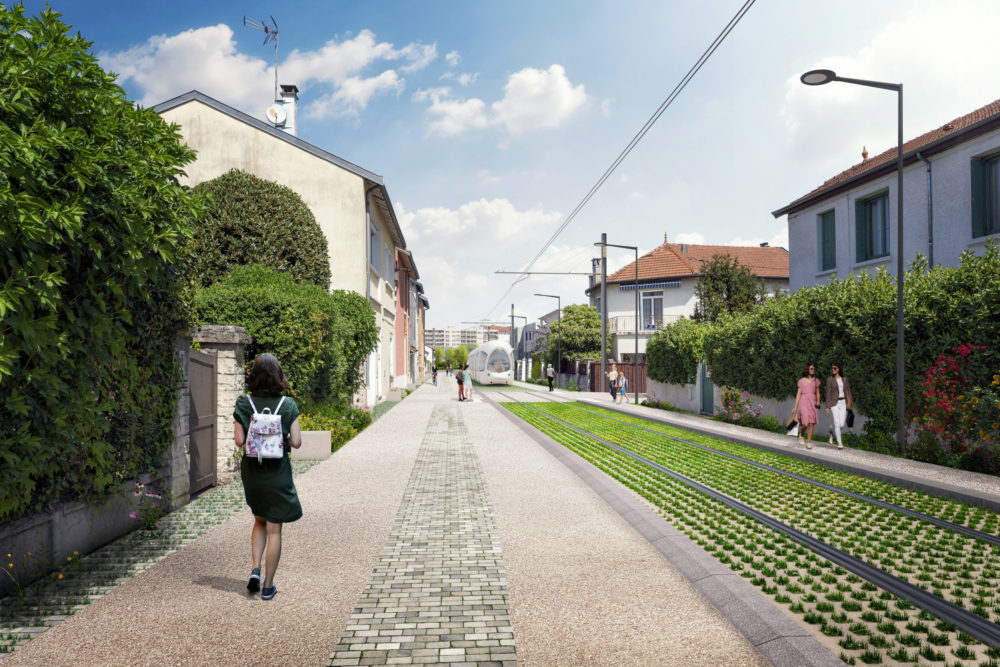 L’extension de la ligne T6 s’étire sur 3 communes, du secteur des hôpitaux Est au campus de la Doua, en passant par les grandes centralités et projets urbains de Villeurbanne : la place Grand Clément et ZAC Grand Clément, le secteur historique et patrimonial des Gratte-Ciel et la ZAC associée. Le projet s’étire sur 5 km et dessert 10 stations avec un tramway toutes les 7 min pour 55 000 voyages par jours en 2030. Le tissu urbain dense traversé, peu maillé d’axes structurants nord sud accueil le tramway avec un partage des modes volontariste, alternant 13 % d’aires piétonnes, 5% de voies vertes et 10% de zones de rencontres. Sur le reste de l’itinéraires des pistes cyclables larges et confortables et sécurisées accompagnent la ligne.