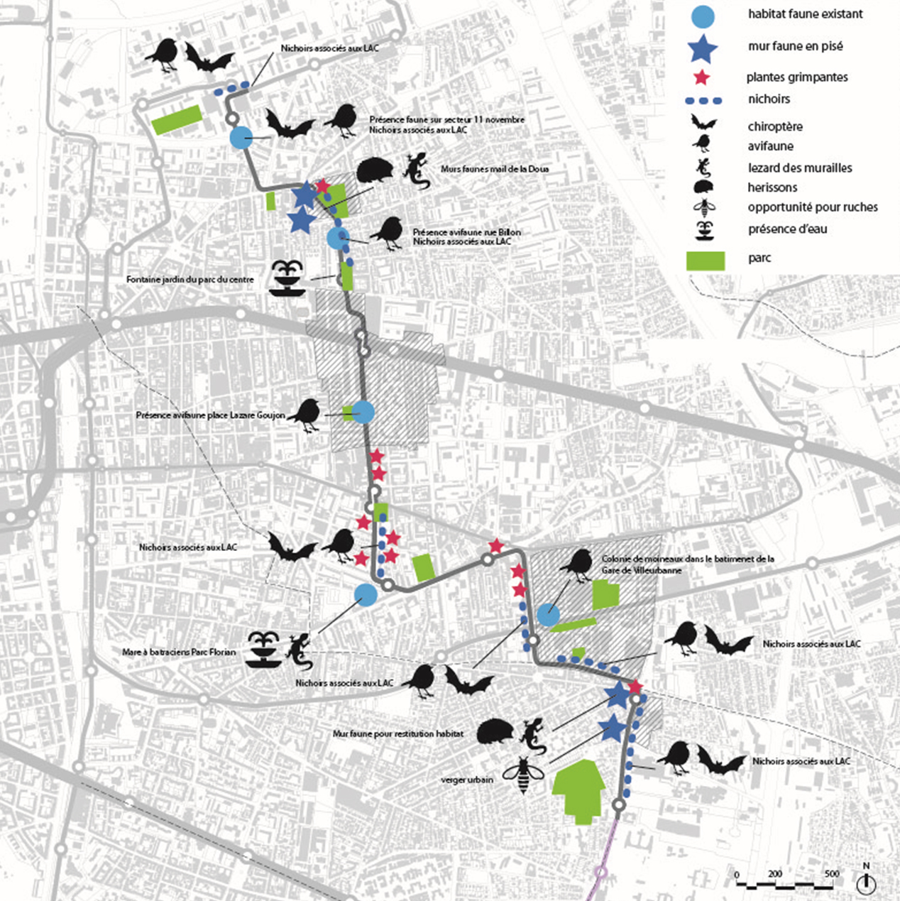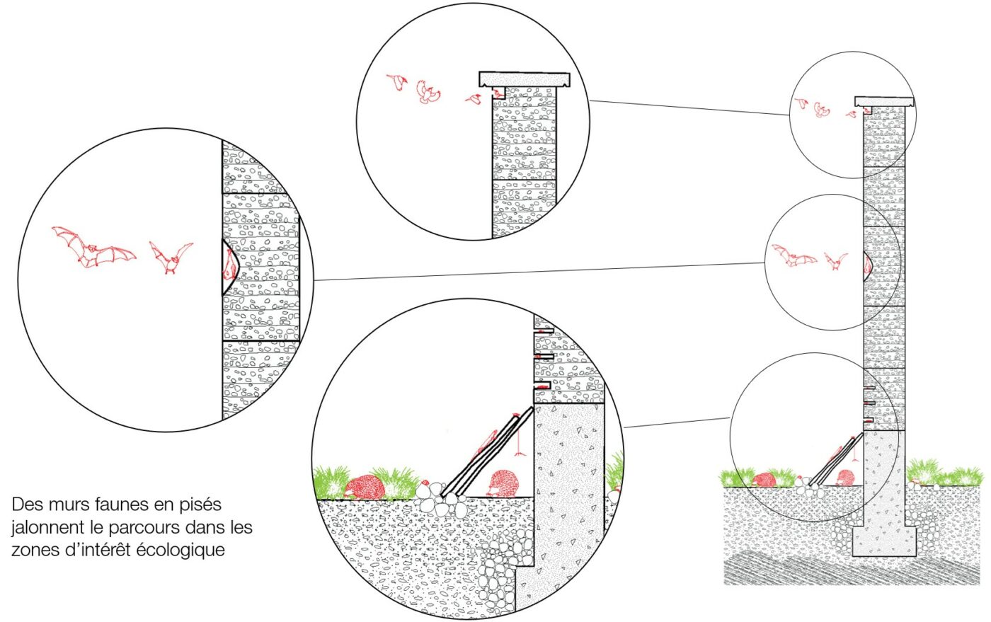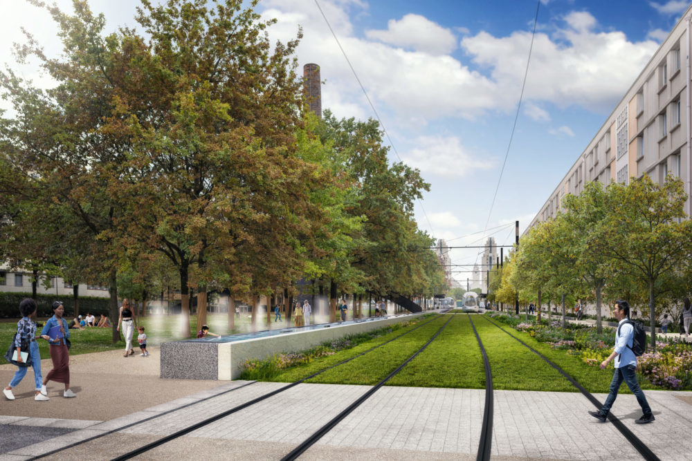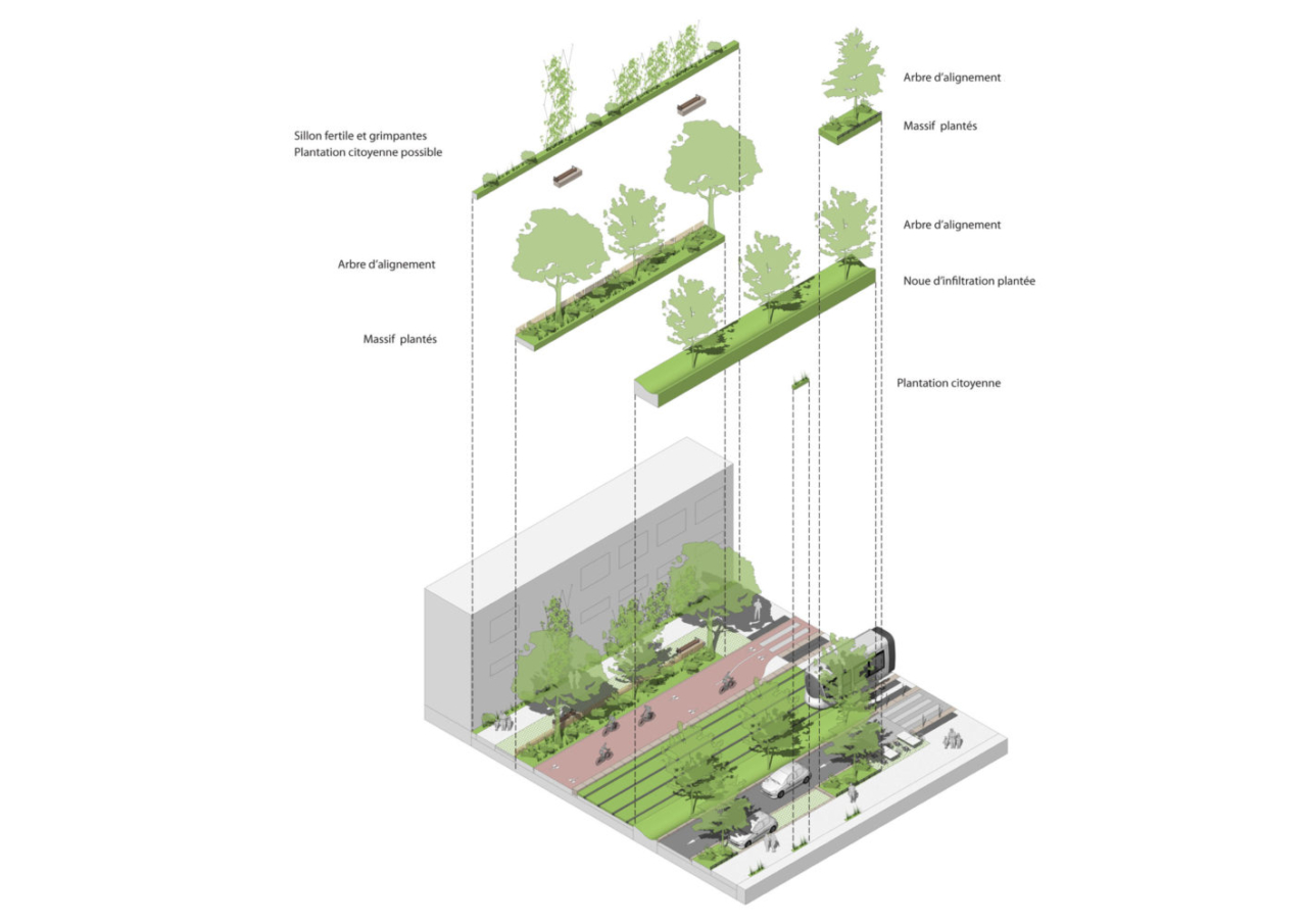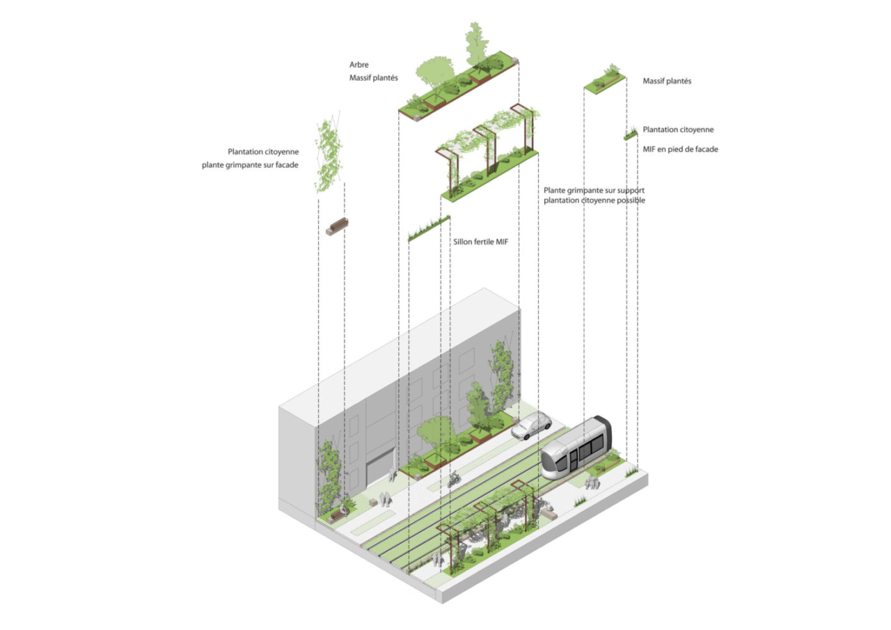 L’armature paysagère qui escorte la ligne est basée sur la préservation du patrimoine végétal existant et un cortège de nouvelles plantations, 560 sujets et 16 000 m² de massifs plantés avec 85 % de variété locales. La création de sols fertiles issus de substrat de réemploi a permis l’utilisation de 30 % de matières issus du site. La nature est aussi intégrée dans le projet, avec la préservation des habitats, mais aussi la création de refuges complémentaires sous forme notamment de murs en pisé aménagés de nichoirs et de gites à chiroptères. Enfin des structures support de plantes grimpantes sont disposées le long des itinéraires piétons quand la plantation d’arbre n’est pas possible, afin de garantir le confort thermique des usagers.
