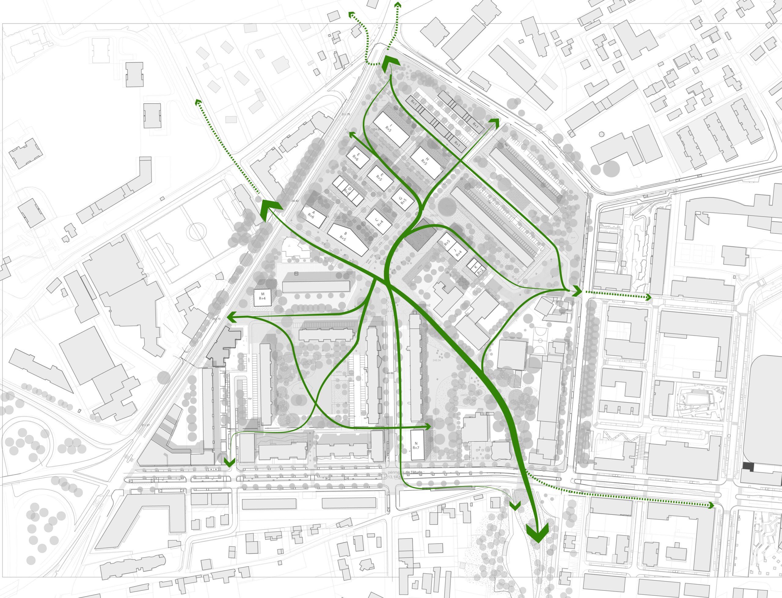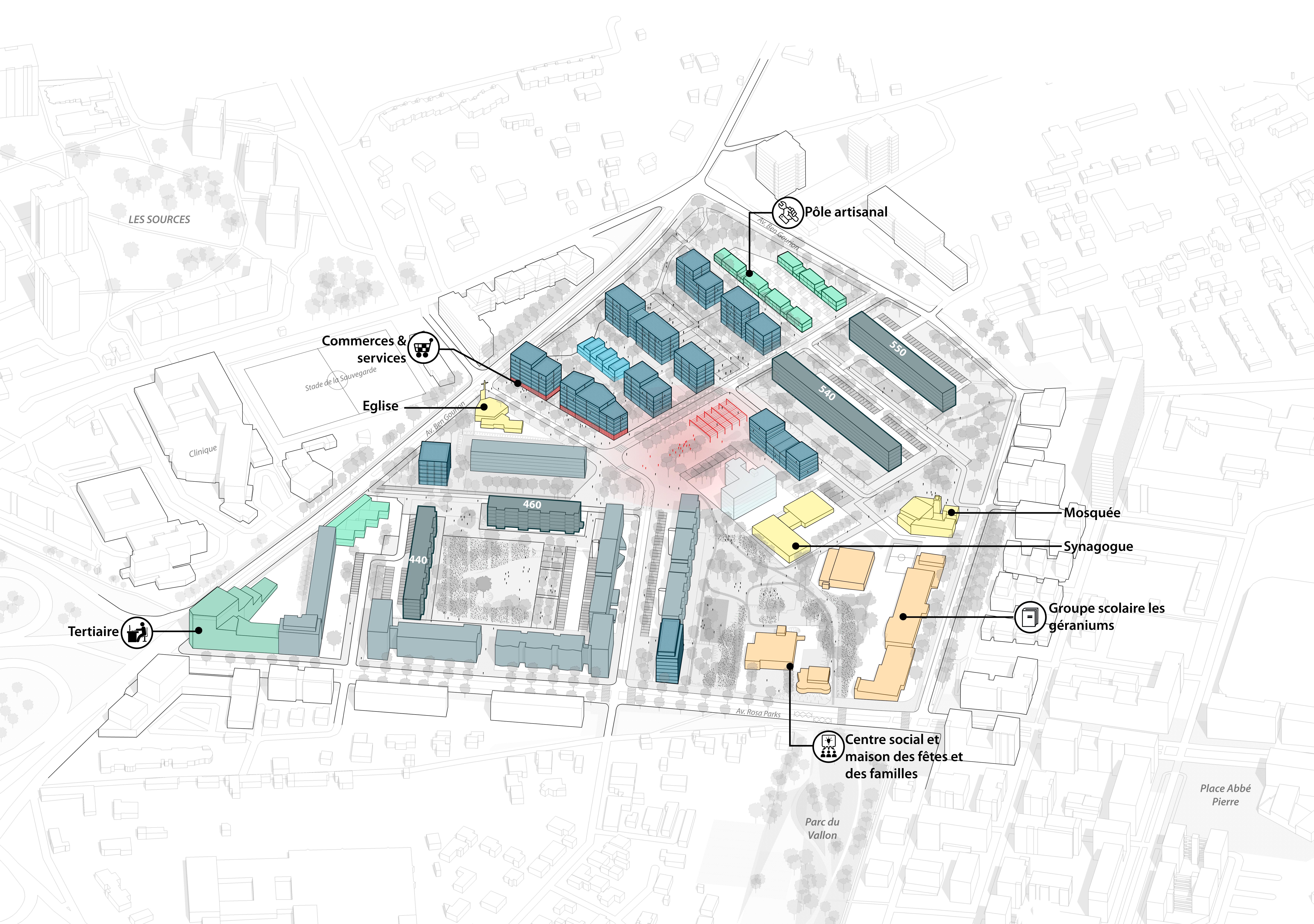 – Une trame d’espace public hiérarchisée, qui s’appuie sur les axes externes du quartier pour libérer un cœur apaisé.