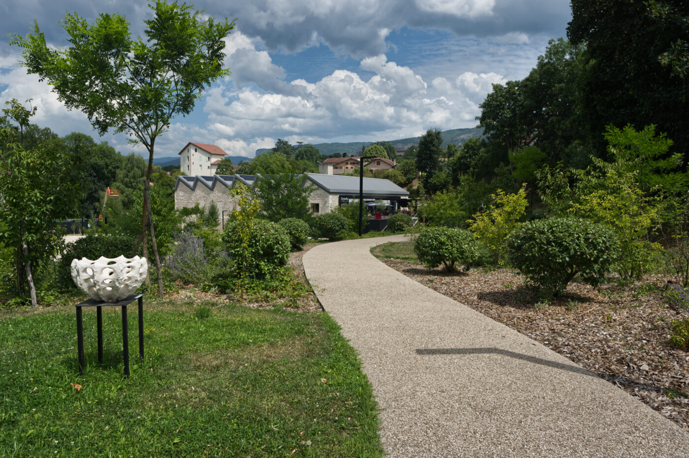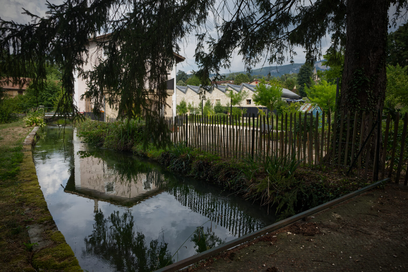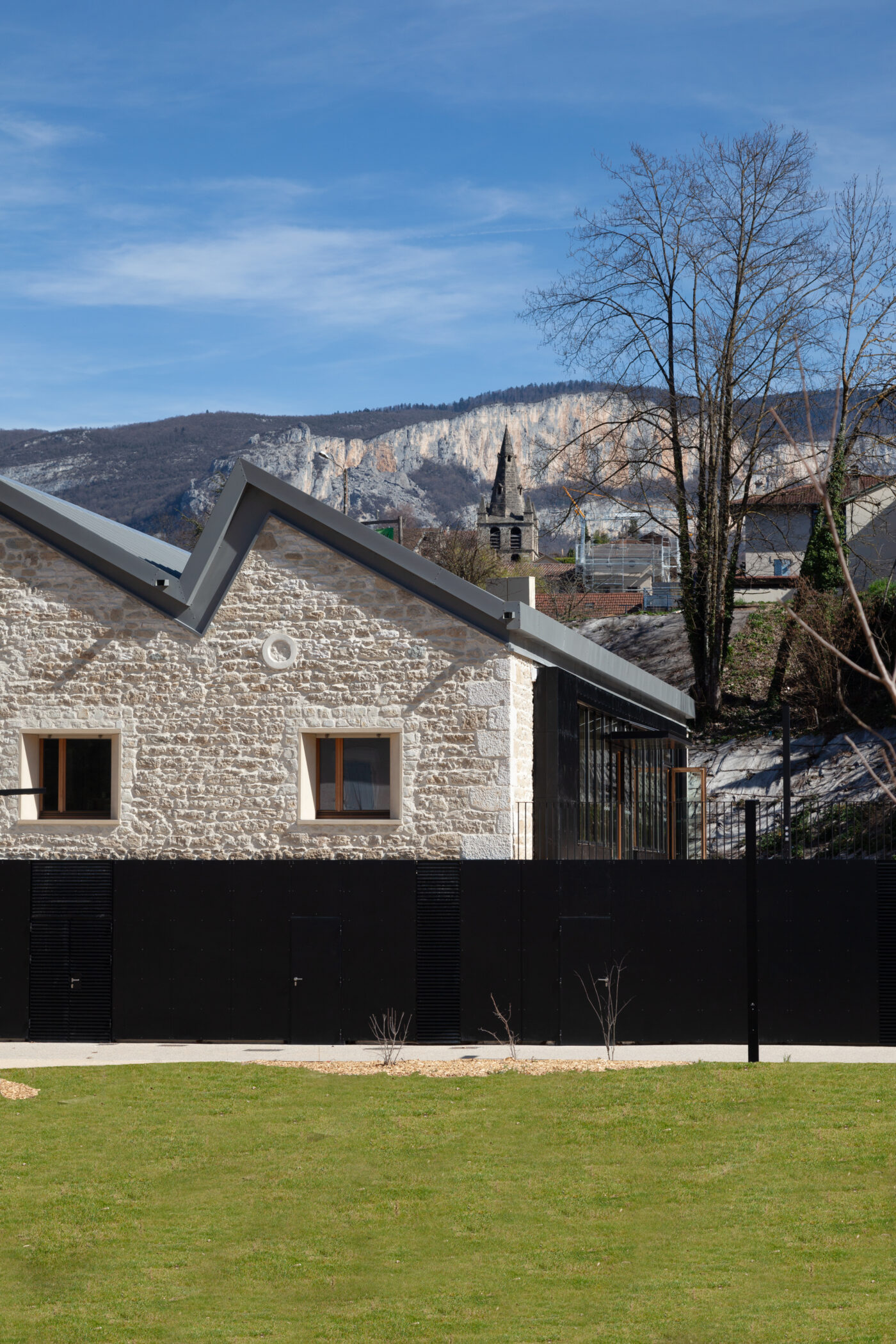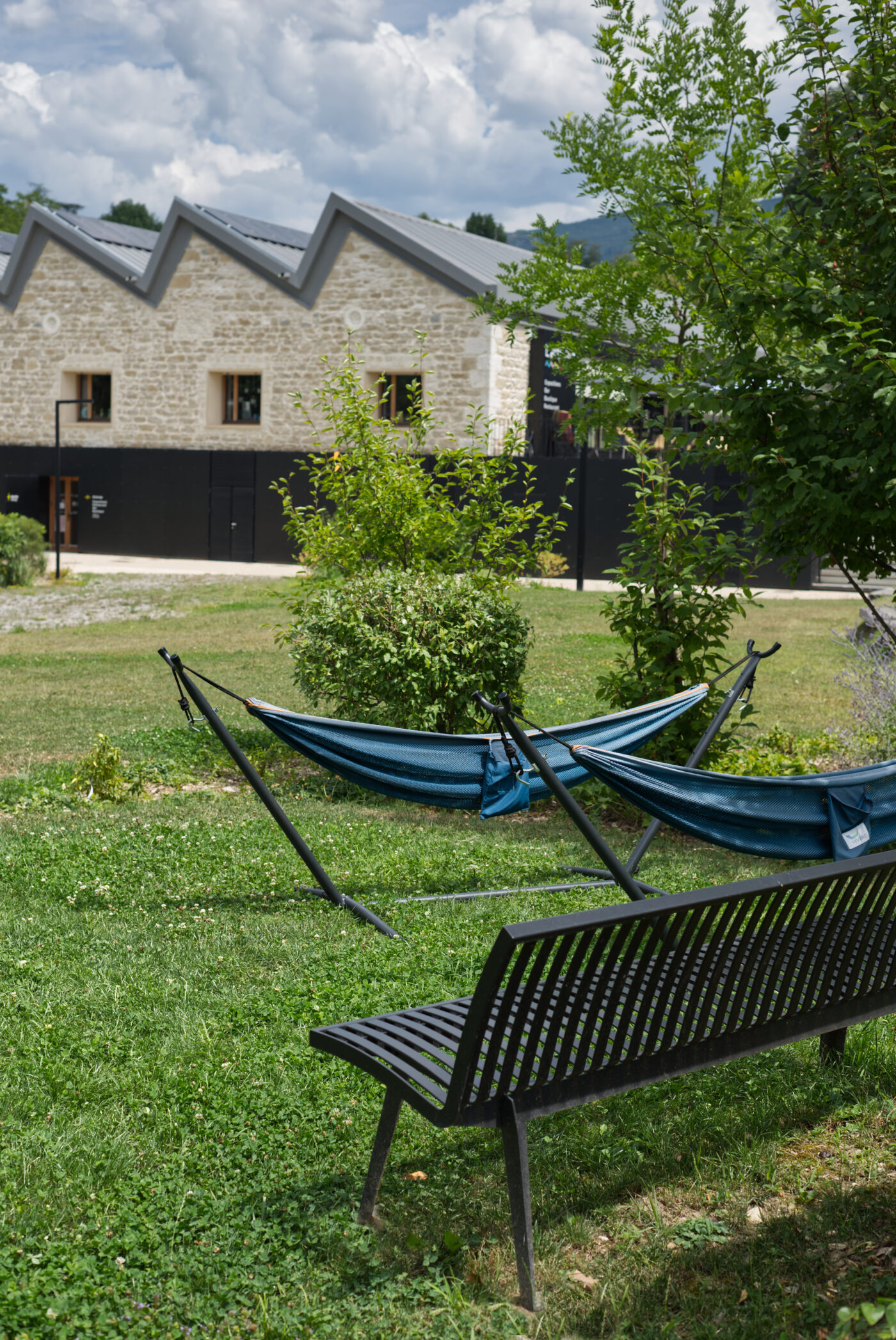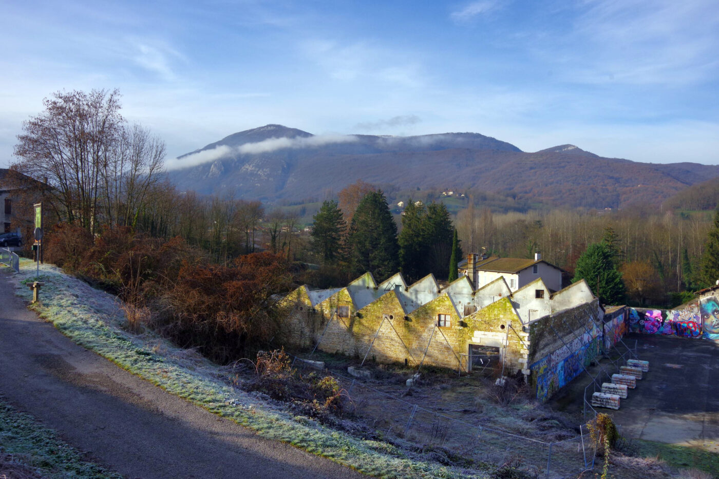 C’est un projet de territoire ancré dans la communauté du Royans-Vercors, implanté au cœur de la ville de Saint-Jean en Royans. Les premières constructions du site remontent au 15° siècle. Aujourd’hui constitué d’une ancienne usine de tissage construite en 1886, alimentée par un canal ainsi qu’une maison de maître, le lieu est marqué d’une empreinte industrielle affirmant un lien particulier avec l’histoire du village. Les murs de l’usine ont été préservés. Les sheds et leur silhouette reconstitués pour rappeler l’origine du bâtiment et marquer sa présence en contrebas de la route, au contact de la rivière la Lionne.