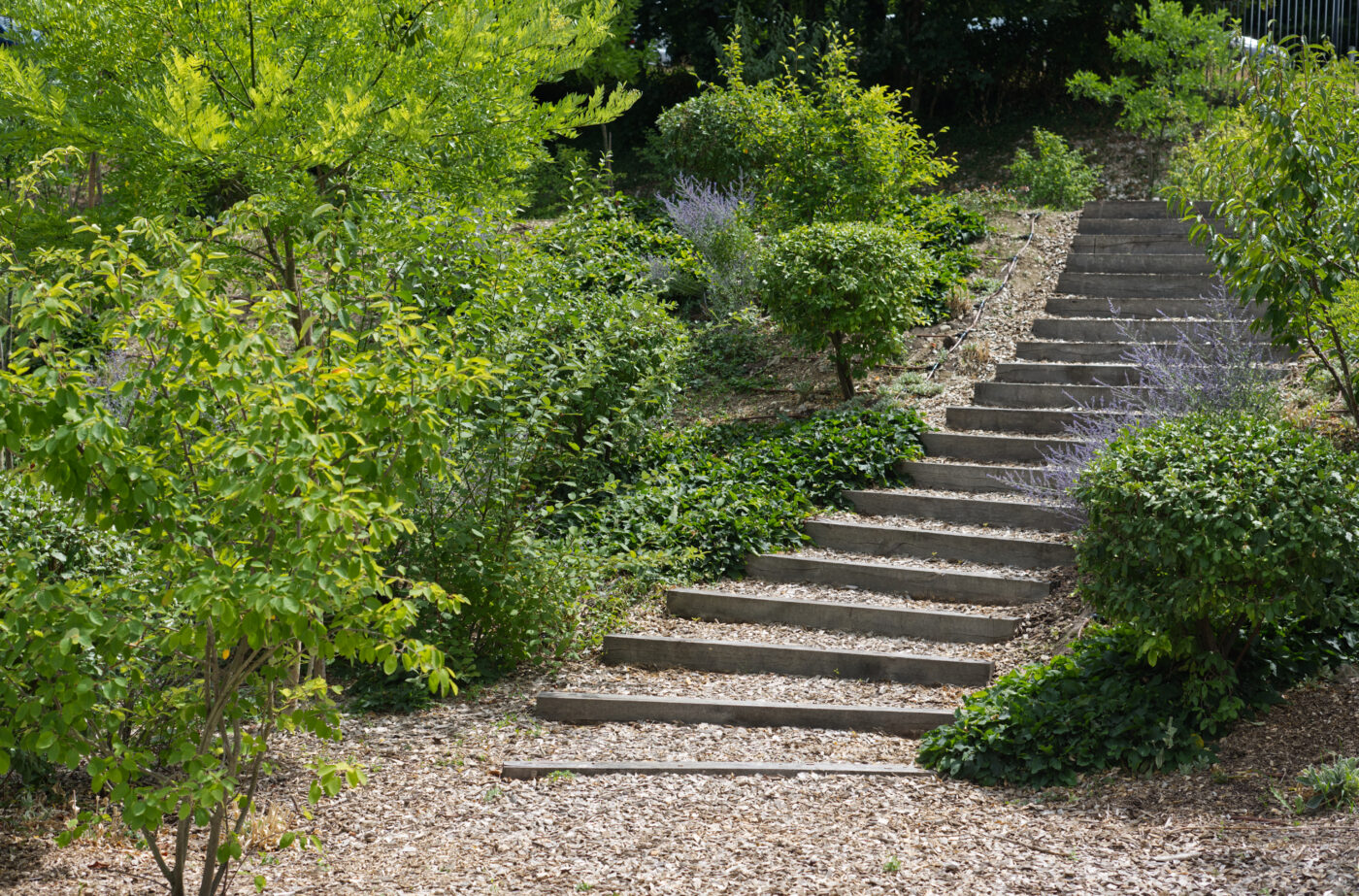 Autour du bâtiment un jardin ouvert et perméable articule des noues d’infiltration et un amphithéâtre de nature ponctué de gradins en bois.