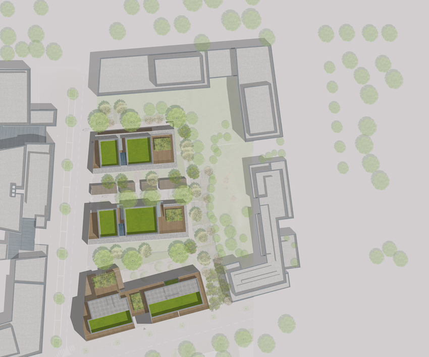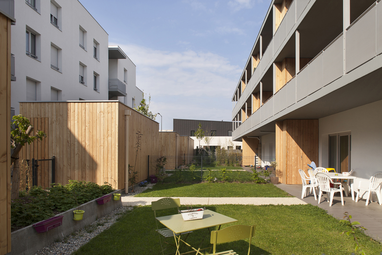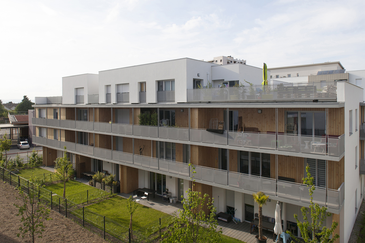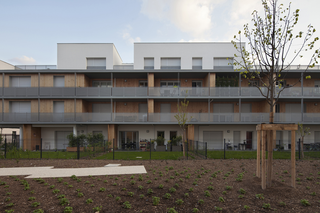 Ce projet se compose d’un habitat collectif et intermédiaire, au-dessus d’un socle fédérateur, trois bâtiments de hauteurs différentes se dessinent autour d’un îlot central lumineux. La typologie des logements traversant et la forme du bâtiment, privilégient l’utilisation d’un système mixte bois/béton ainsi que de la brique. Des Logements traversants, spacieux, accessibles, la notion de confort, d’évolutivité (d’adaptabilité) domine. L’organisation du plan masse permet de développer des «porosités», traduites par des vues / passage vers le cœur de l’îlot : un rapport sensible entre espace public et privé. L’objectif est de réaliser un aménagement de la parcelle permettant de vivre «les pieds dans l’herbe».
