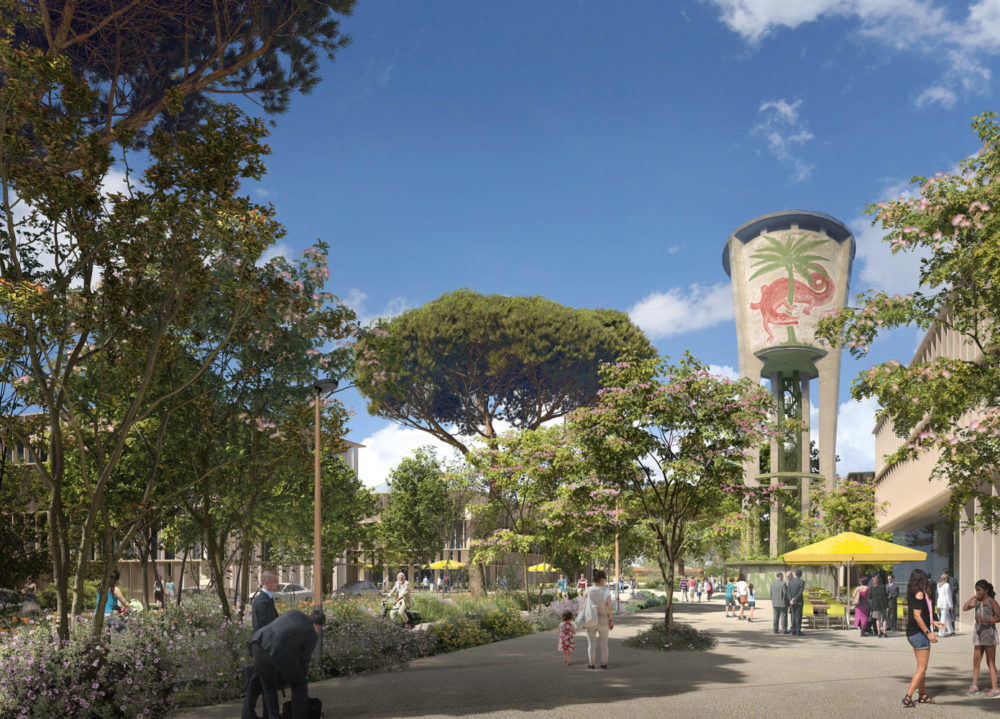 - Places et parvis : Ces espaces publics sont plus minéraux favorisant la circulation des usagers et l’accueil de terrasses ou d’évènements. Des beaux arbres seront plantés pour créer de l’ombre et accompagner ces différents usages.