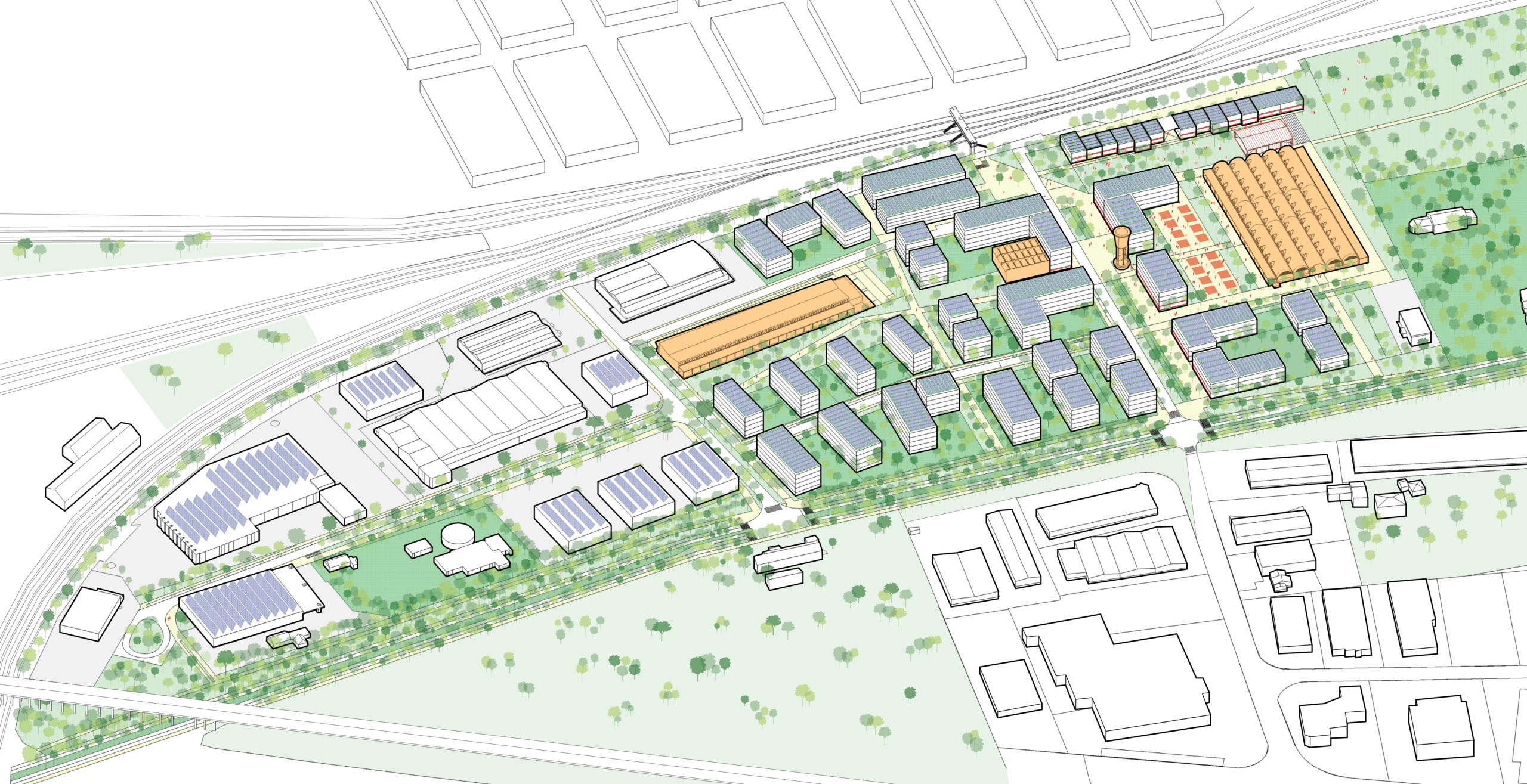 La requalification du site permettra de reconsidérer sa frange nord-ouest pour aménager des carrefours d’entrée sécurisés et de créer une véritable lisière forestière. Une bande boisée support de plusieurs fonctions : paysagère, hydraulique, de biodiversité, de fraicheur, et d’une voie verte pour les modes actifs. Cette nouvelle trame paysagère marquera l’entrée dans la ville avec un tissu urbain maillé, hiérarchisé et dense.