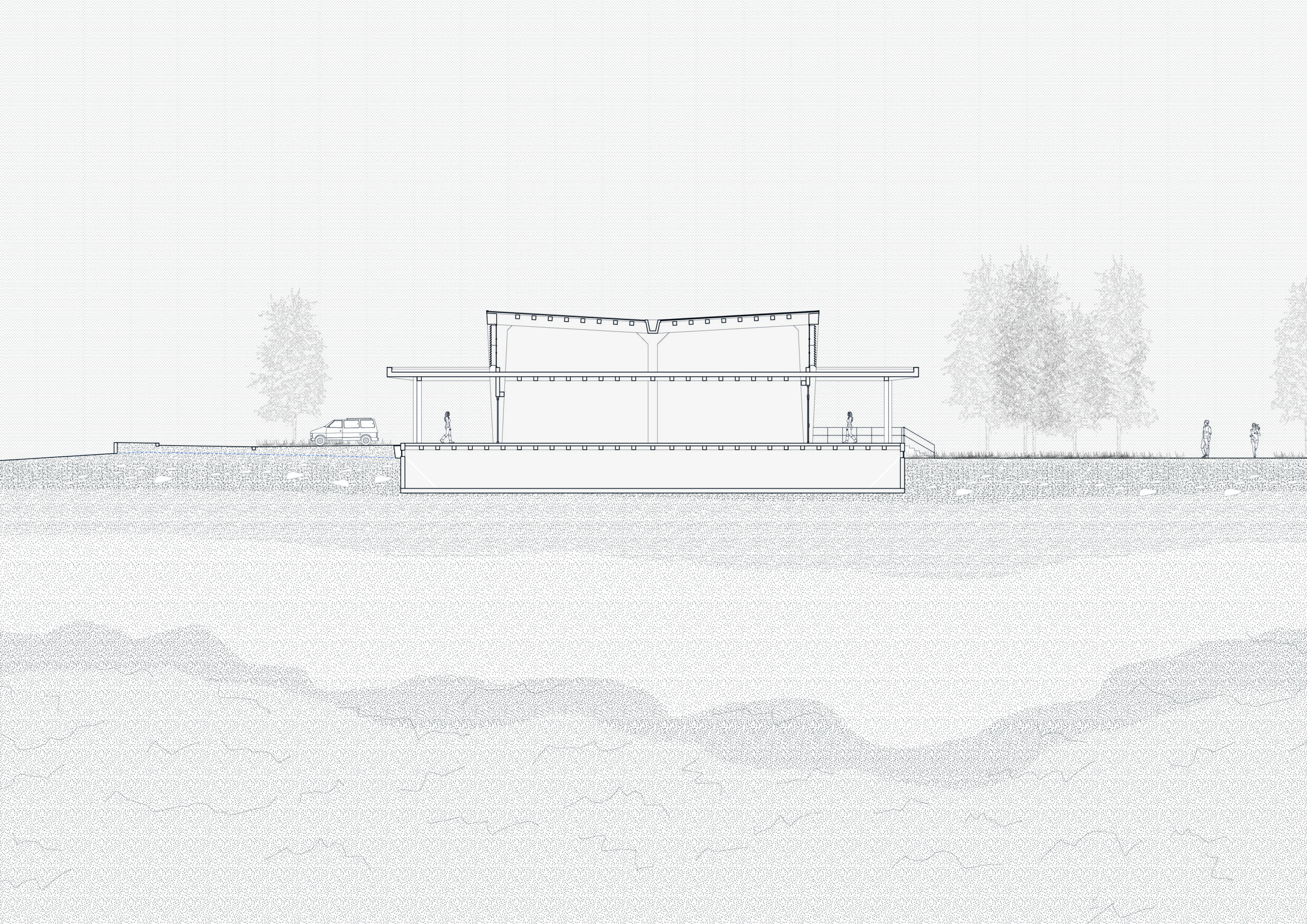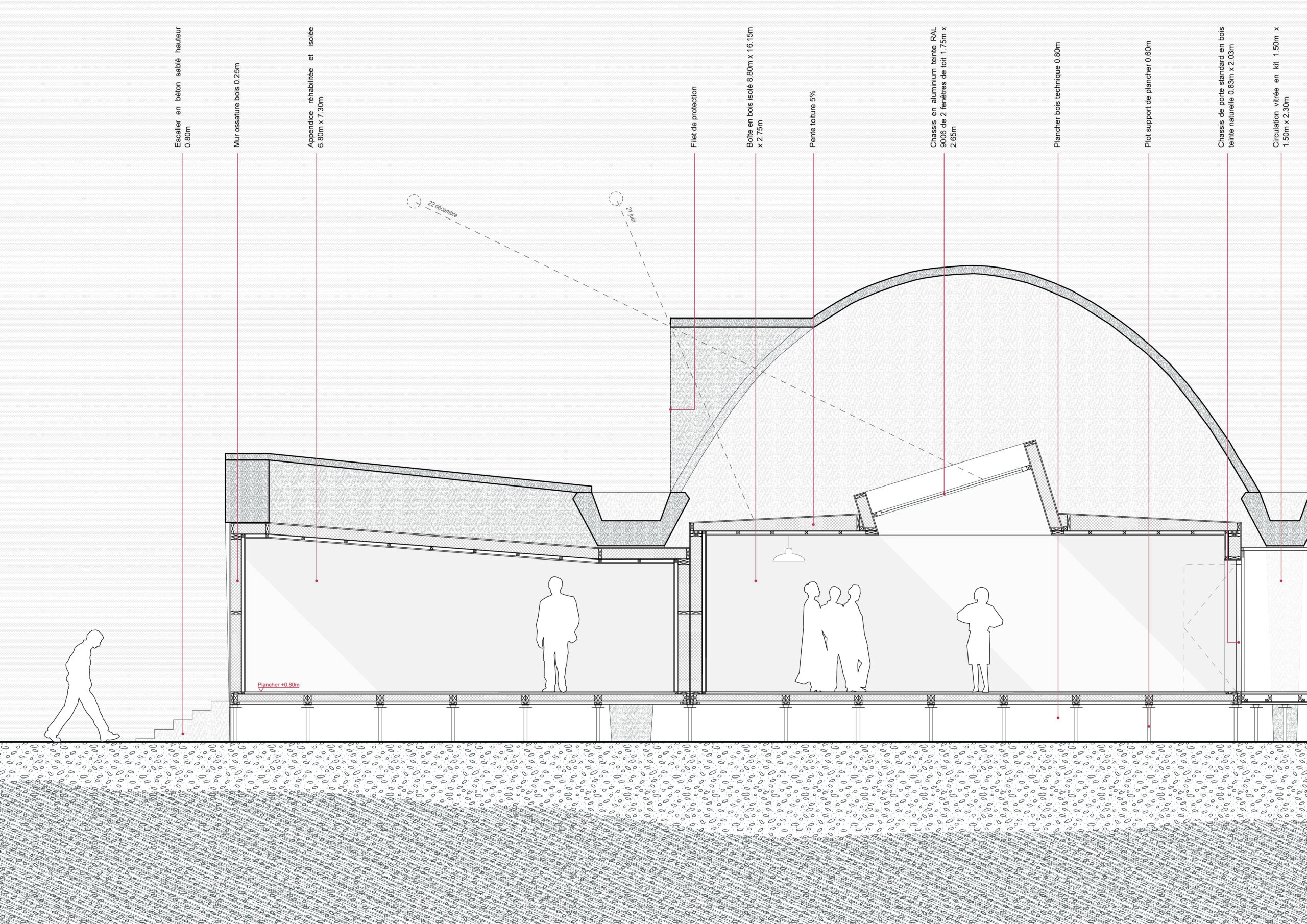 La composition urbaine et les constructions sur pilotis favorisent un sol libre maximisant la surface perméable. Une perméabilité qui permet de mieux gérer le risque inondation et d’infiltrer l’eau à la parcelle. Ce sol principalement en pleine terre est une base fondamentale pour le projet paysager.