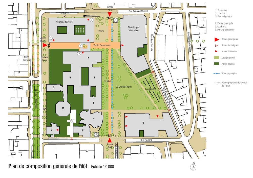 Le nouveau bâtiment constitue une nouvelle centralité ou cœur de campus, au barycentre des pôles majeurs de l’UJM : vie étudiante, médiathèque, place, bâtiment K et bien sur la place à l’entrée du parc. Cette centralité est un lieu de vie, qui rassemble étudiants, enseignants, personnel. Le projet de restructuration comprend également la réhabilitation lourde de nombreux bâtiments existants.